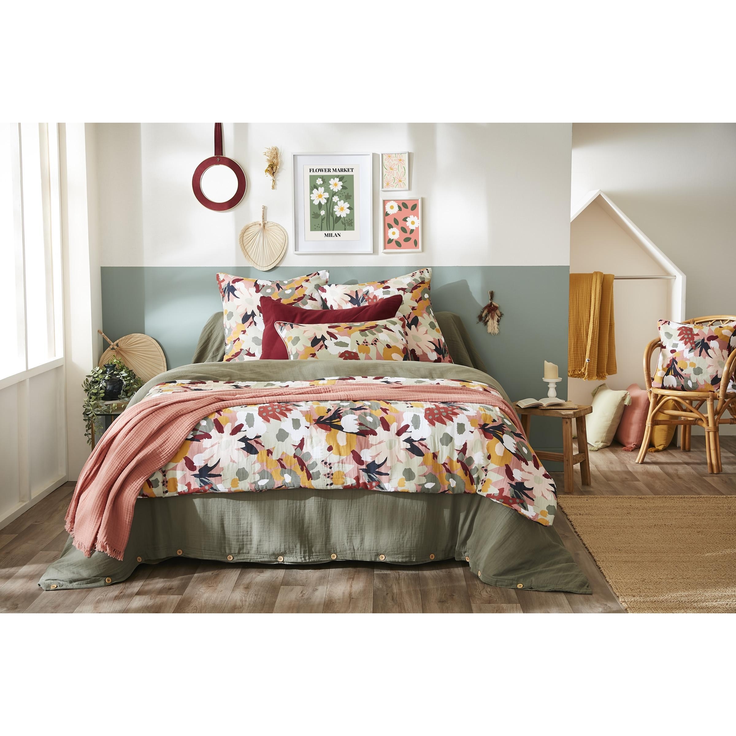 Transformez instantanément votre chambre en un espace chaleureux, élégant et rempli de personnalité grâce à ce bout de lit 90 x 200 cm en gaze de coton imprimée LÉANE. Son motif floral généreux, mêlant des nuances vibrantes de rose poudré, bordeaux, moutarde, vert sauge et touches de blanc, apporte une touche artistique et lumineuse à votre décoration.