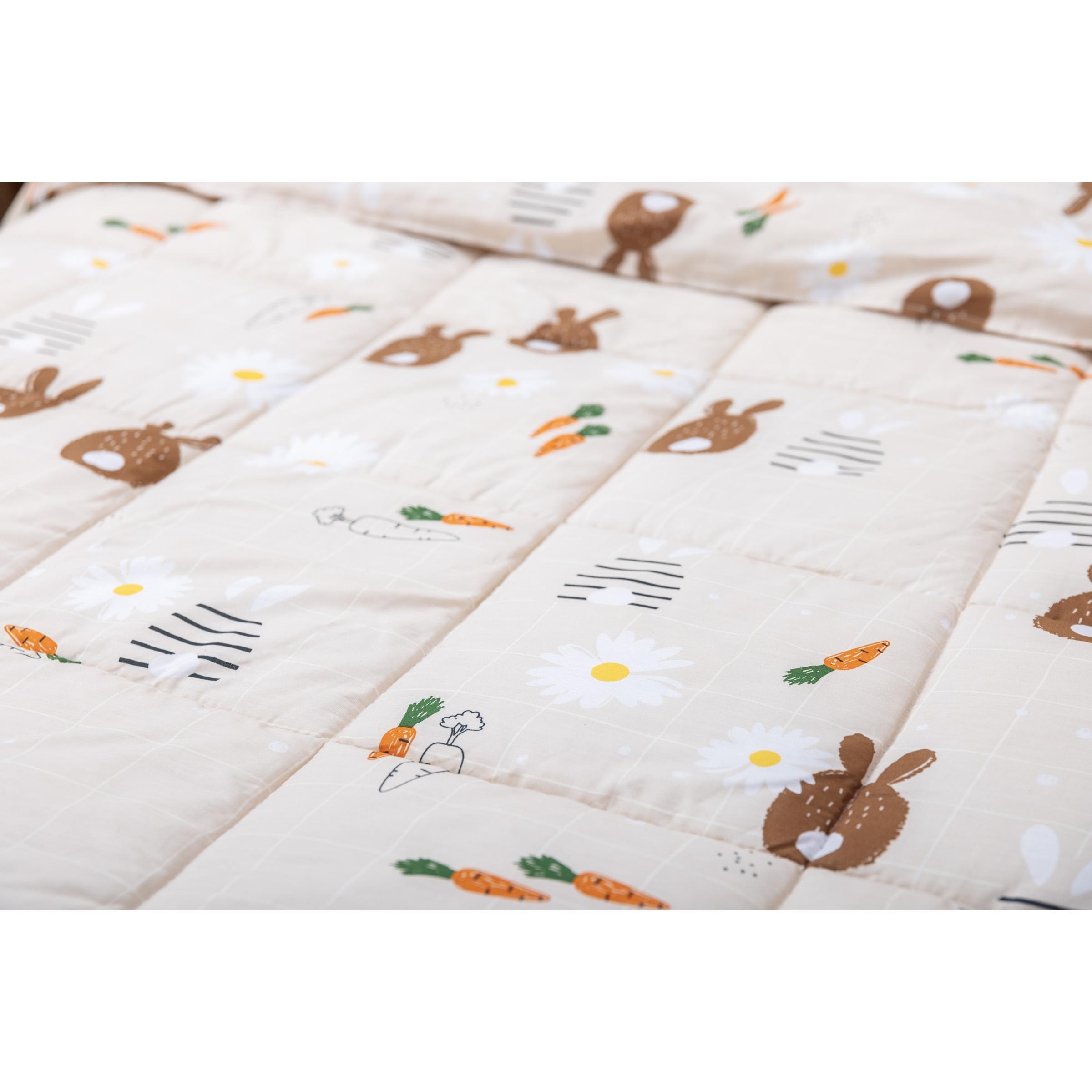 Très jolie couette réversible tempérée pour enfant en coton + 1 taie d'oreiller 60x60 cm dans les tons crème et marron avec un imprimé lapin et carotte.
