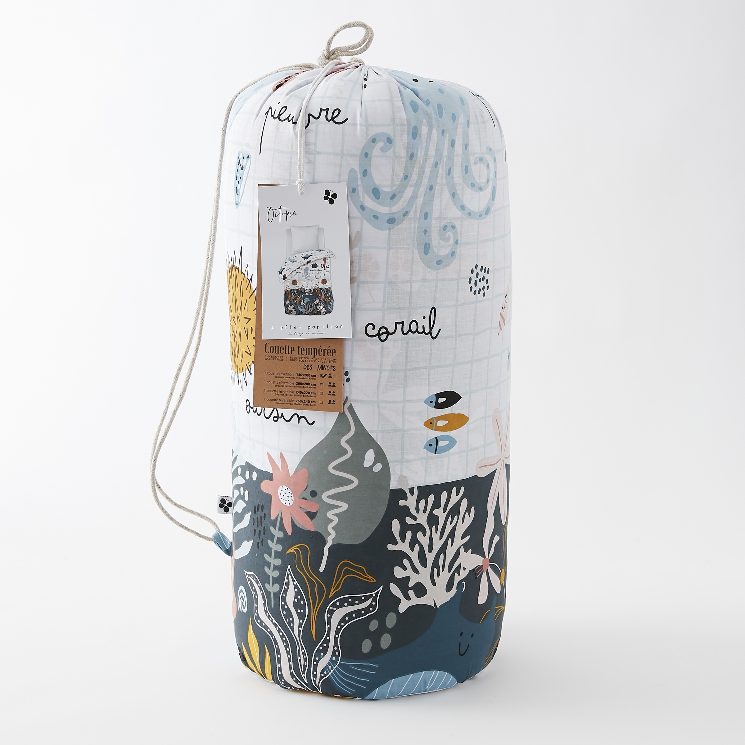 Livrée dans un sac en coton avec une bandoulière, cette couette peut être utilisé sans ou sans housse de couette grâce à son imprimé ludique.