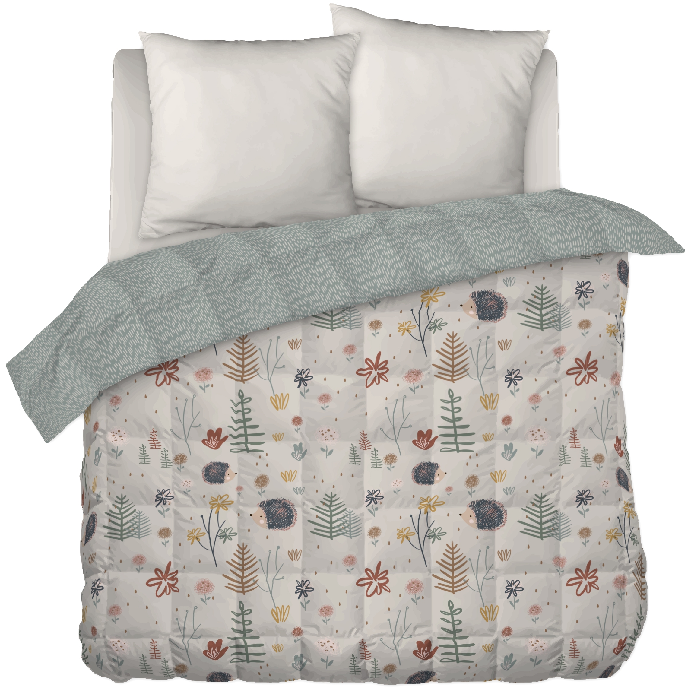 Côté design, la couette Polisson séduit par son imprimé poétique inspiré de la nature : fleurs stylisées, feuillages délicats et petits hérissons malicieux qui apportent une note joyeuse et tendre à la décoration. Son verso contrasté vert sauge orné de motifs graphiques permet de changer d’ambiance selon vos envies – une vraie couette réversible deux-en-un.