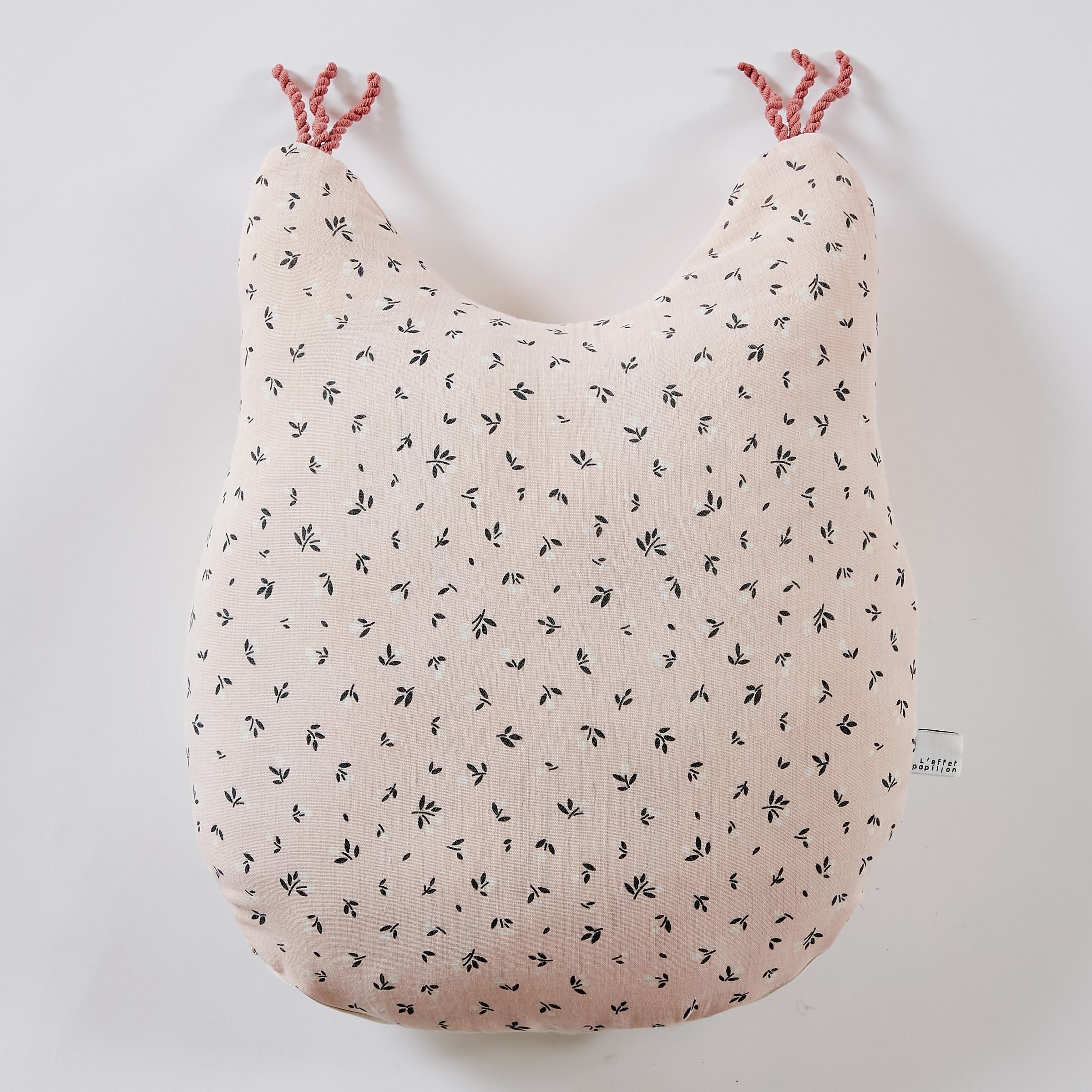 Ce coussin est recto-verso : une face illustrée d’un écureuil souriant dans des tons rose poudré et brun noisette, et une face à motif feuillage délicat pour un rendu poétique et raffiné.