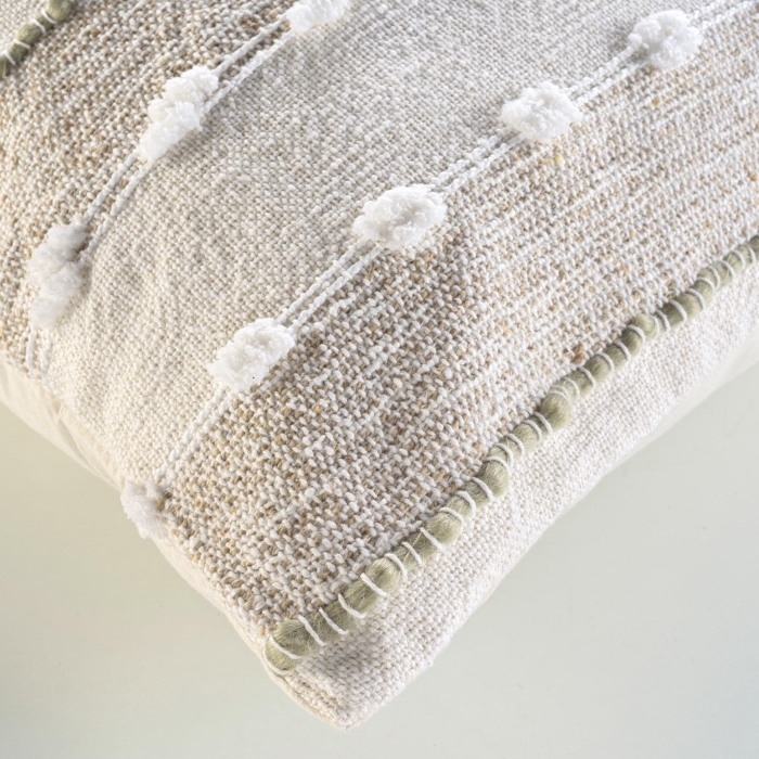 Son tissage fantaisie en coton et polyester joue sur les textures avec des rayures en relief et effets bouclette, donnant un aspect artisanal et tendance. Déhoussable et compressé, il est pratique à entretenir et reprend rapidement sa forme après ouverture.