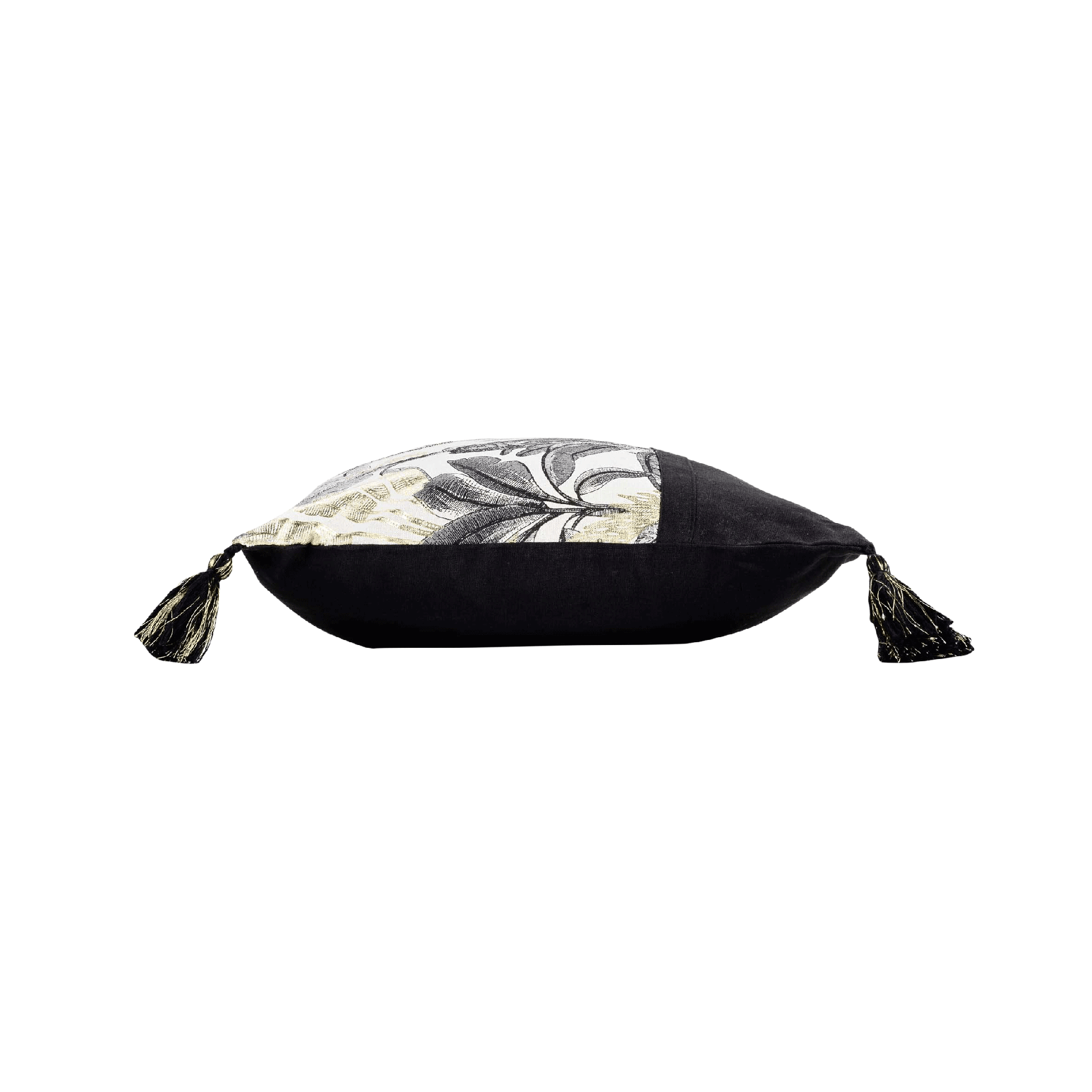 Apportez une touche chic et exotique à votre intérieur avec ce coussin décoratif au motif tropical rehaussé de détails métallisés. Son design associe des feuillages élégants en noir, gris et doré, sur un fond clair, pour un rendu raffiné et moderne. Les pompons aux quatre coins ajoutent une note bohème et tendance, parfaite pour sublimer un canapé, un fauteuil ou un lit.