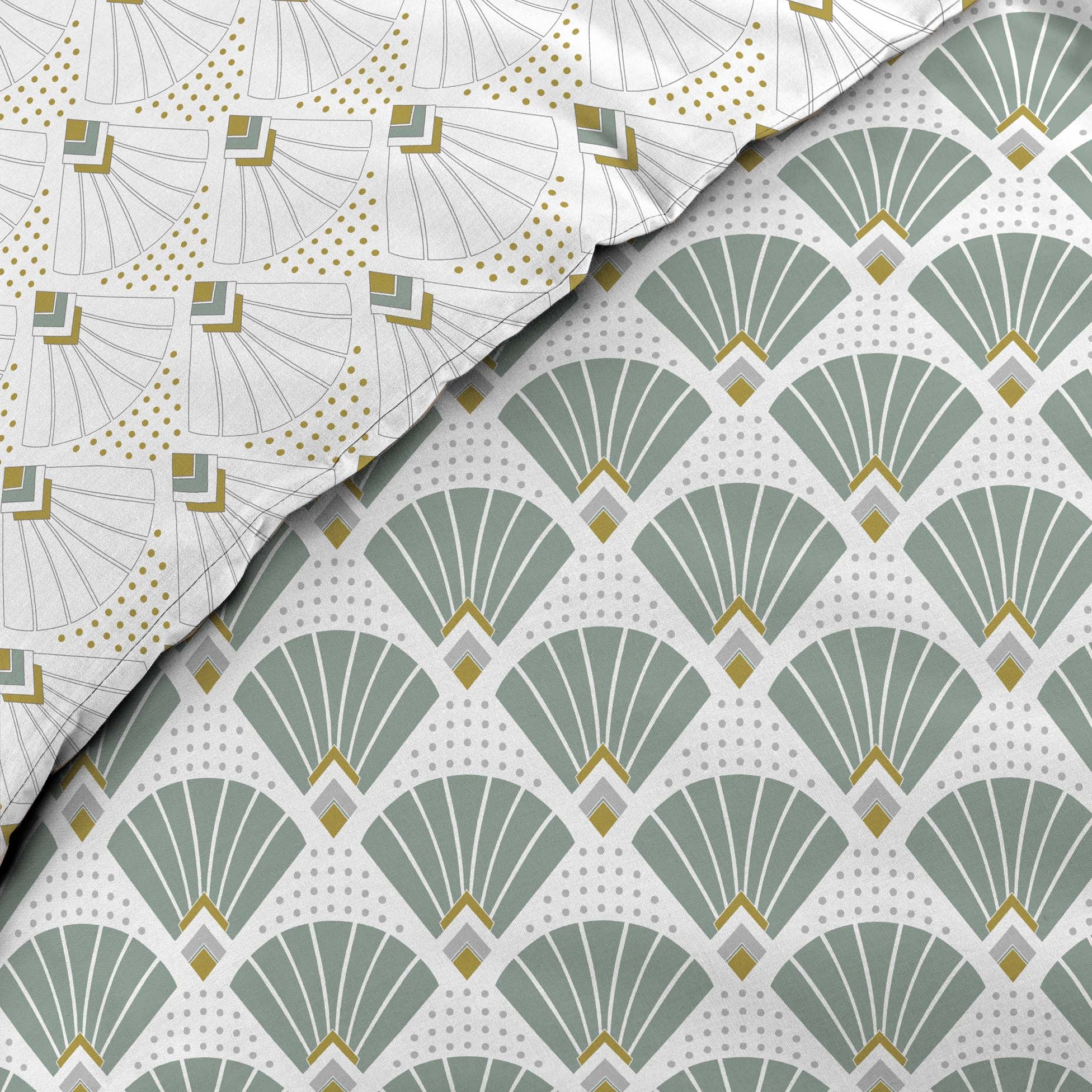 Apportez une touche graphique élégante à votre chambre avec la parure DIANE, un modèle raffiné alliant un motif éventail vert d’eau subtilement rehaussé de touches dorées. Conçue en microfibre douce et respirante, cette housse de couette assure un confort optimal tout en offrant un rendu visuel moderne et lumineux.