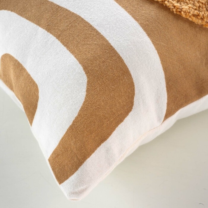 Apportez une touche graphique et chaleureuse à votre décoration avec cette housse de coussin Mirade. Son imprimé camel et blanc, rehaussé de motifs tuftés en relief, crée un contraste dynamique et moderne. Idéale pour un intérieur bohème, contemporain ou naturel.