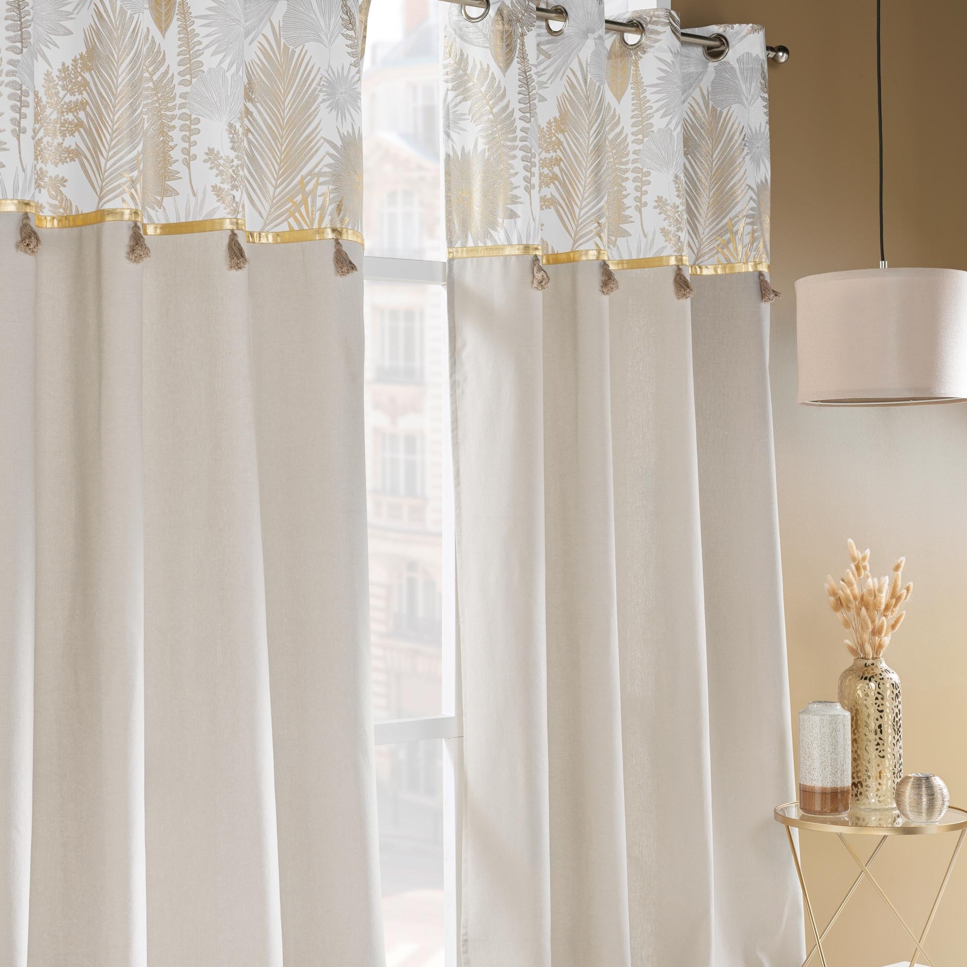 Sublimez votre intérieur avec ce lot de 2 rideaux en polycoton 140x240 cm, au design unique mêlant élégance et modernité. Ces rideaux se distinguent par leur bande supérieure métallisée, ornée de motifs délicats, et par la touche finale apportée par de charmants pompons. Le mélange de polycoton assure un tombé fluide et un toucher doux, tout en garantissant une opacité modérée pour préserver votre intimité.