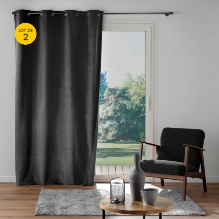 Apportez du cachet et du confort à votre intérieur avec ce lot de 2 rideaux à œillets en velours relief Olympe anthracite. Leur texture douce et leur finition élégante créent une atmosphère chaleureuse et feutrée, idéale pour un salon ou une chambre. Grâce à leur doublure 100% occultante et thermique, ils vous protègent efficacement de la lumière extérieure, du froid en hiver et de la chaleur en été.