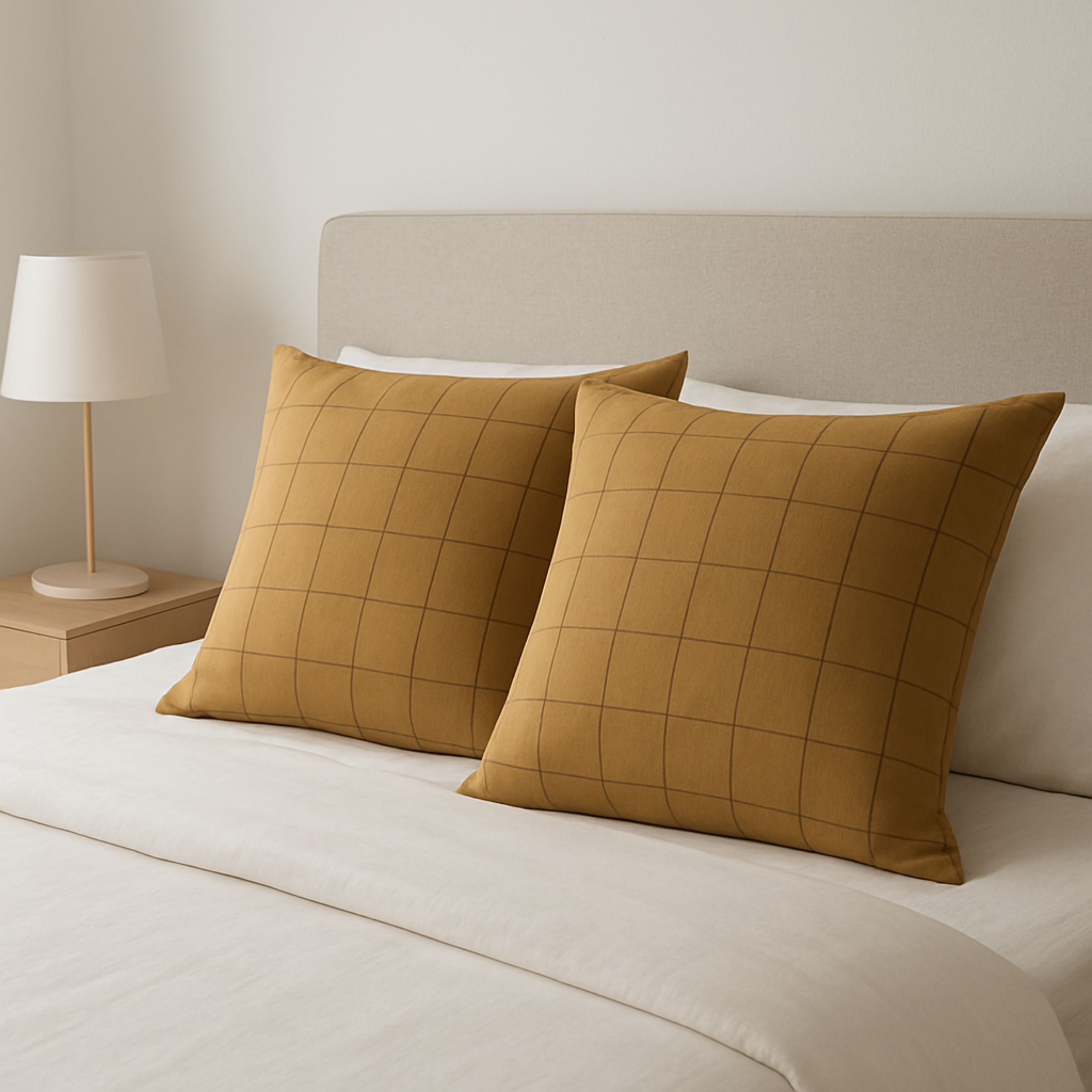 Leur motif discret à carreaux sur fond caramel apporte du caractère tout en restant facile à associer avec différents styles de linge de lit.