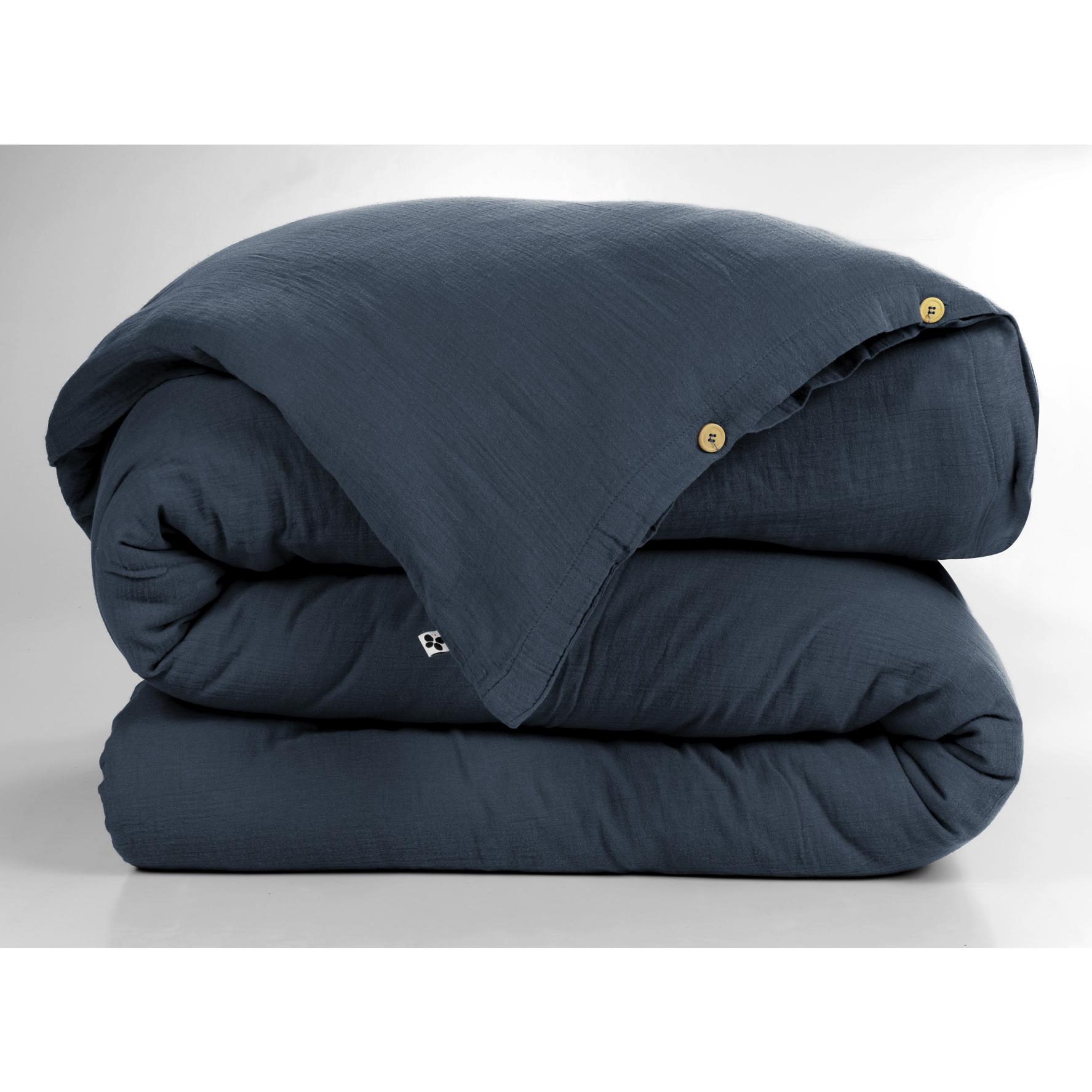 Notre housse de couette + 2 taies en double gaze de coton Bio 240 x 220 cm Bleu foncé aux finitions soignées est à la fois douce, résistante et légèrement froissé. La gaze de coton est incroyablement vivante .