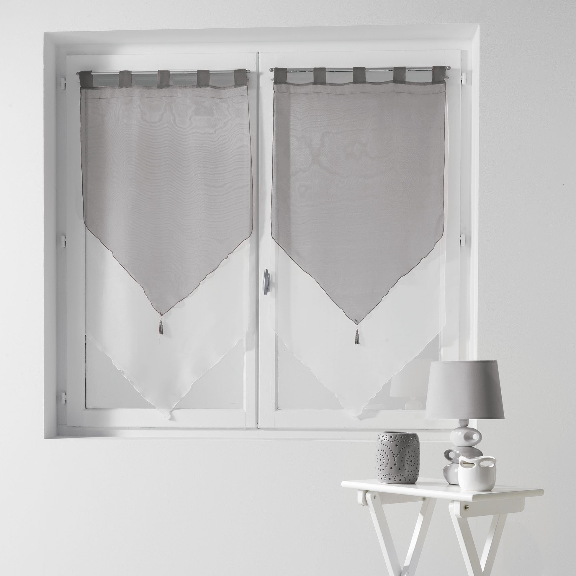 Découvrez le charme des voilages brise bise vendus par paire idéal pour les fenêtres de cuisine. La paire de voilage duo 2 x 60 x 120 cm Blanc/gris existe en plusieurs tailles et couleurs différentes pour plaire au plus nombreux. Les brise bise duo avec leur finition pompons se fixent facilement sur votre tringle. Lavable en machine.
