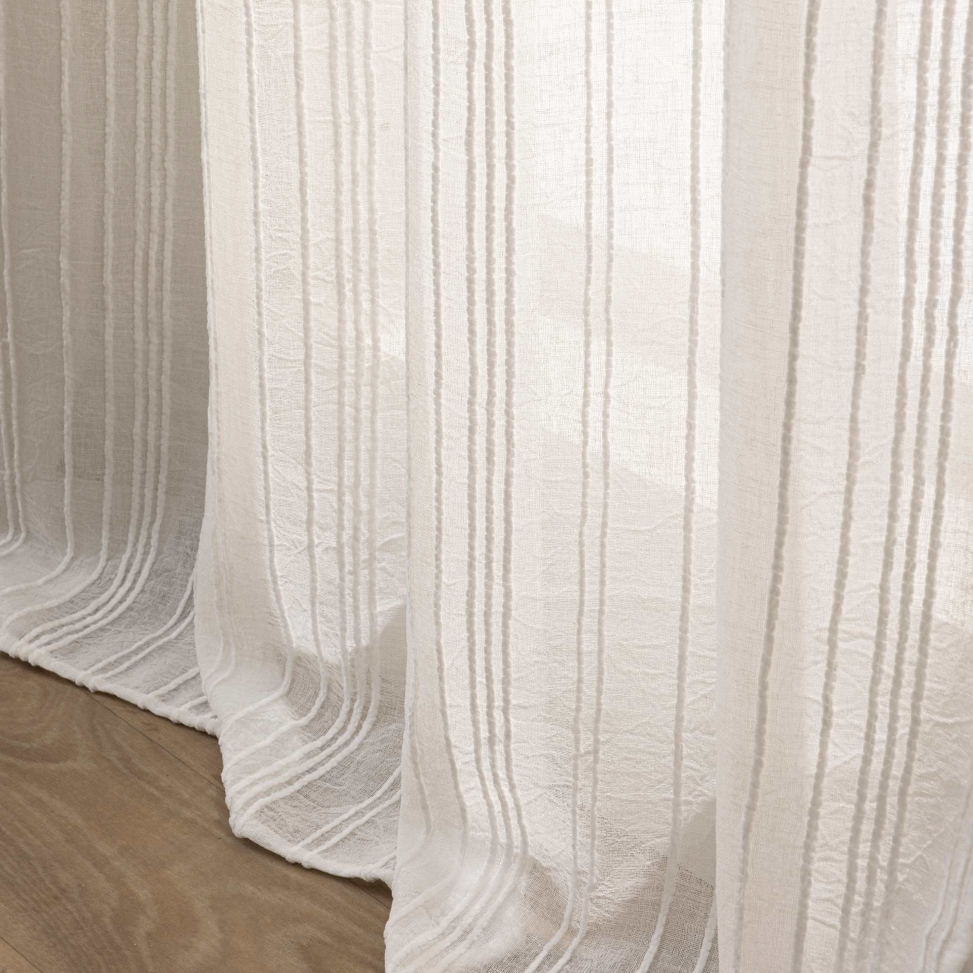 Apportez relief et élégance à votre intérieur avec le voilage Zaho. Son voile tissé effet crash associé à des fils chenille crée un jeu de textures raffiné et contemporain. Ses fines rayures verticales apportent de la hauteur visuelle tout en diffusant délicatement la lumière pour une atmosphère douce et chaleureuse.