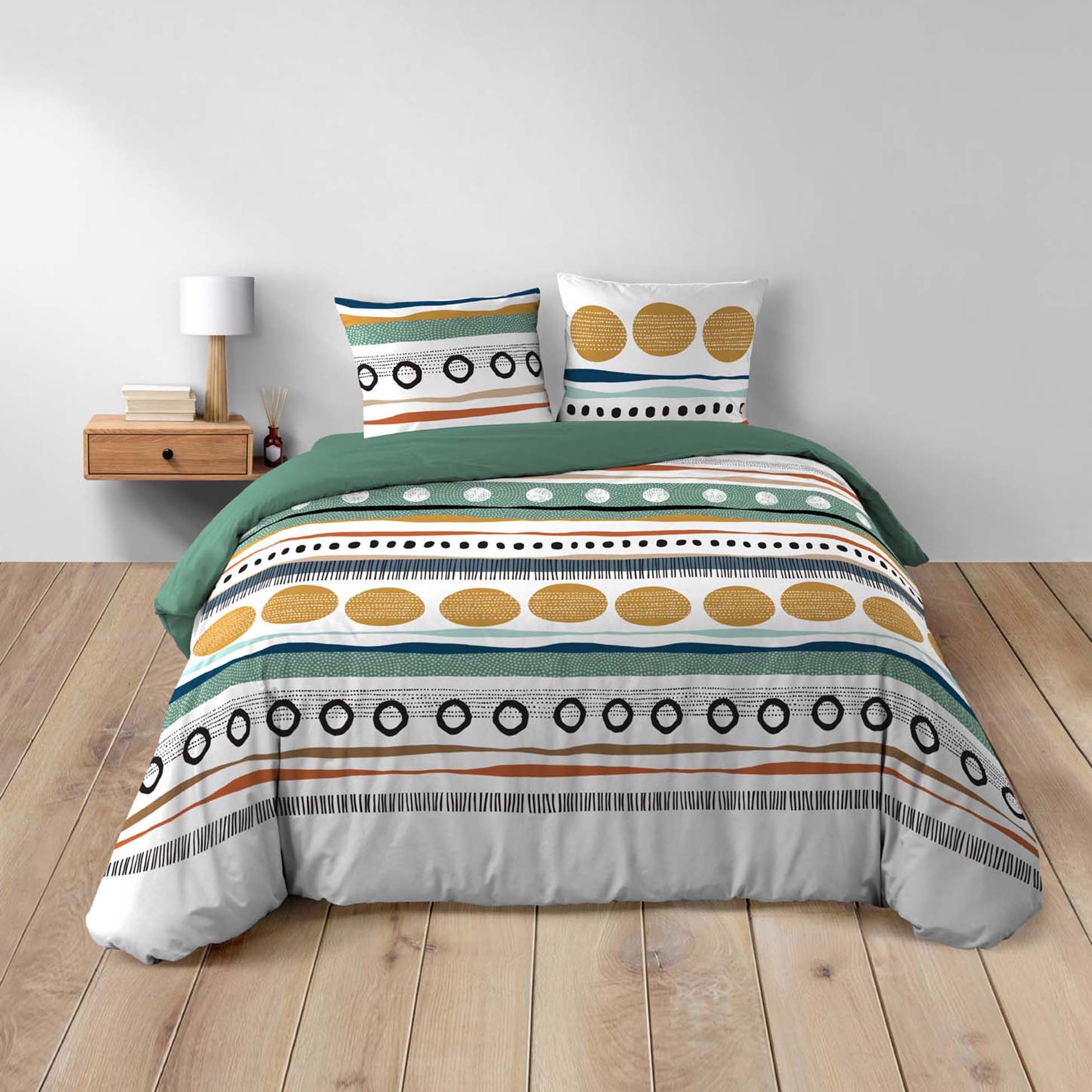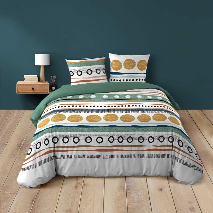 Apportez une touche graphique et ethnique à votre chambre avec cette housse de couette 240 x 220 cm ASIANA, accompagnée de 2 taies assorties. Son motif géométrique rythmé de lignes, points et cercles, associé à des teintes naturelles, vertes et ocres, crée une ambiance moderne, chaleureuse et originale.