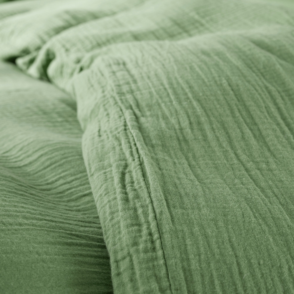 Laissez-vous séduire par cette parure en gaze de coton olive légèrement gaufrée, un choix parfait pour une chambre confortable et élégante.