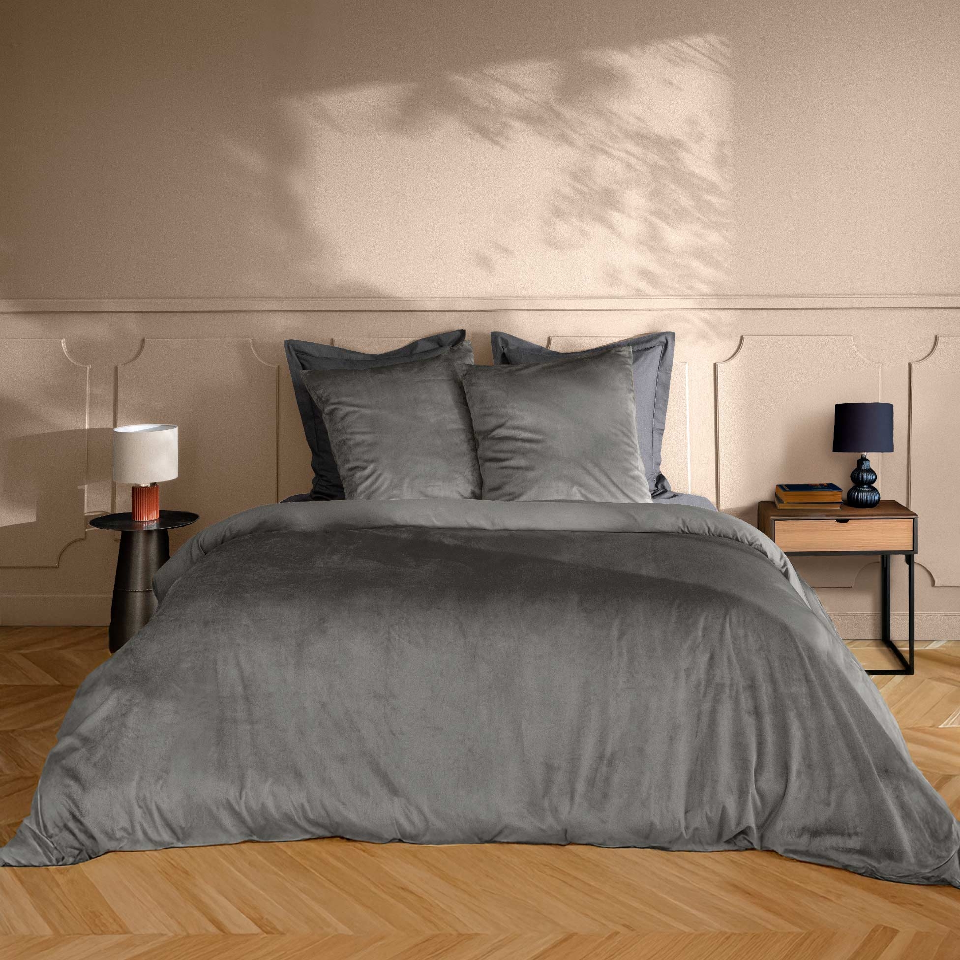 Housse de Couette 240 x 220 cm – Velours Uni – Velina Anthracite + 2 Taies