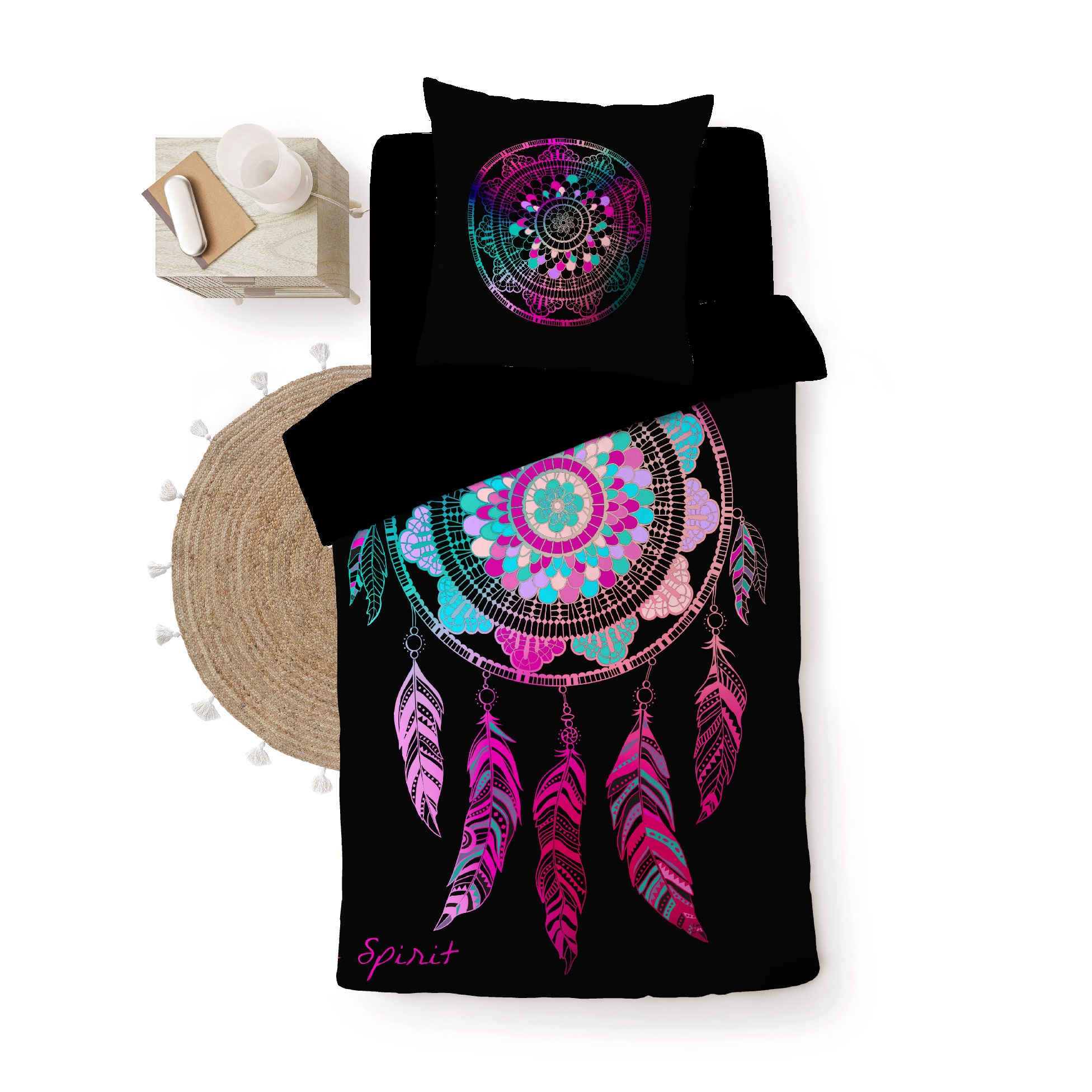 Apportez une note bohème et colorée à votre chambre avec la parure de lit PORTE BONHEUR. Confectionnée en pur coton 42 fils/cm², elle offre confort, douceur et résistance pour un linge de lit agréable au quotidien.