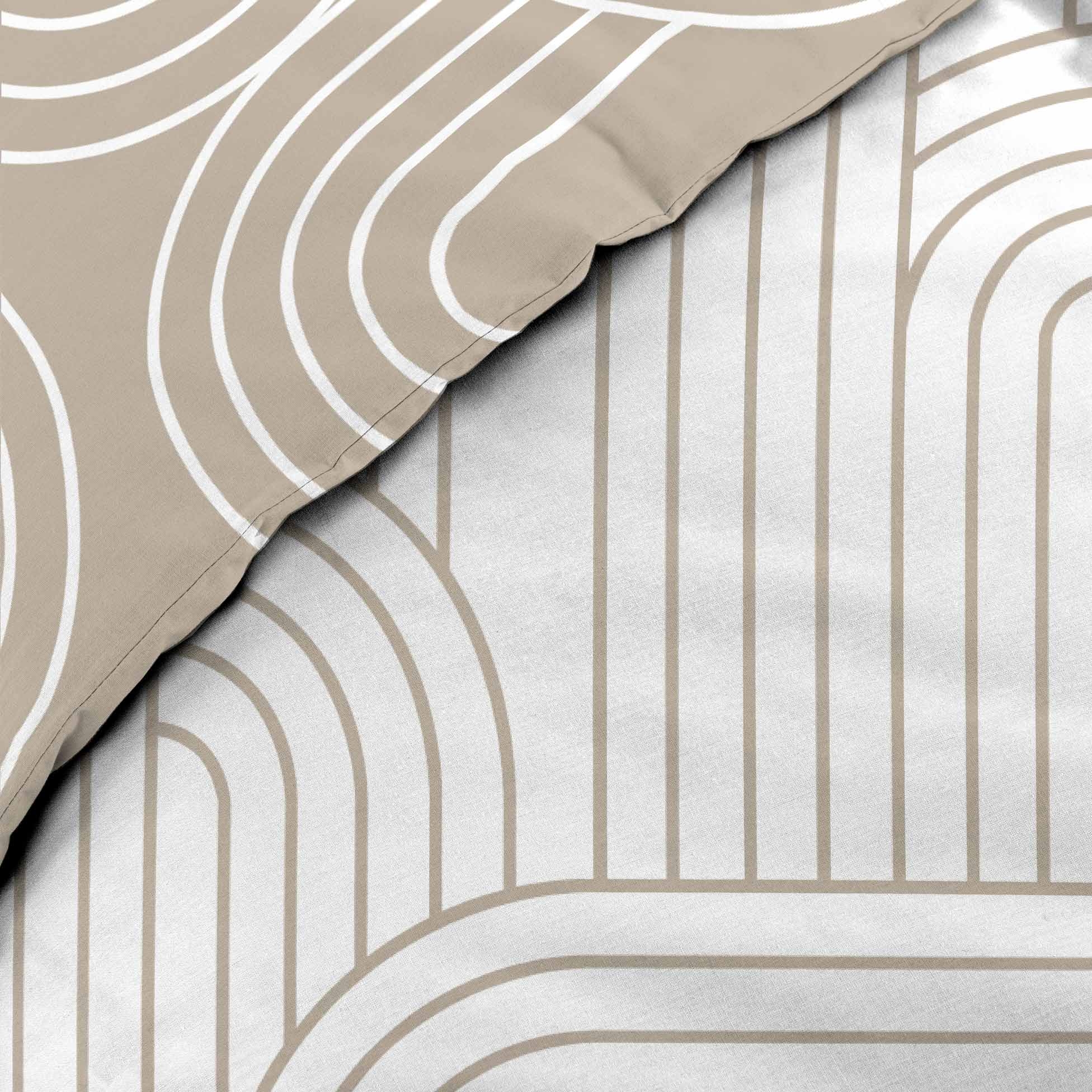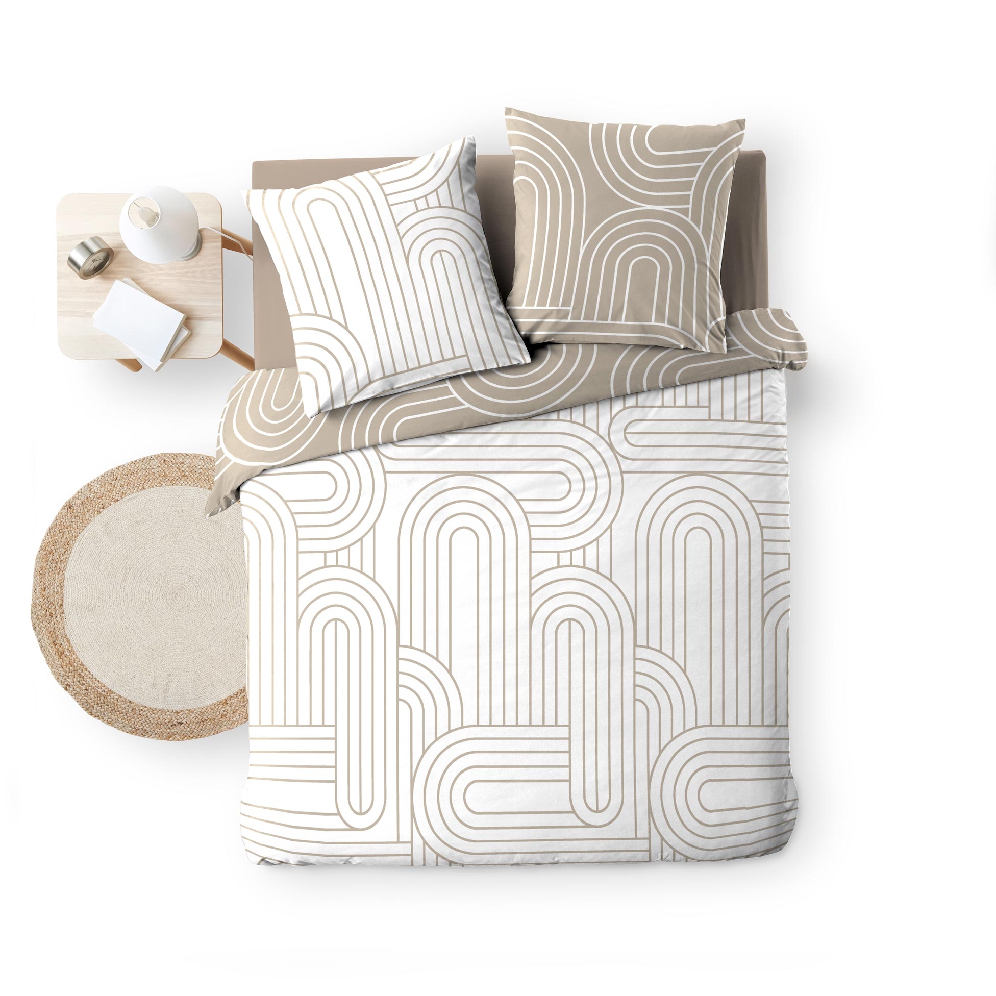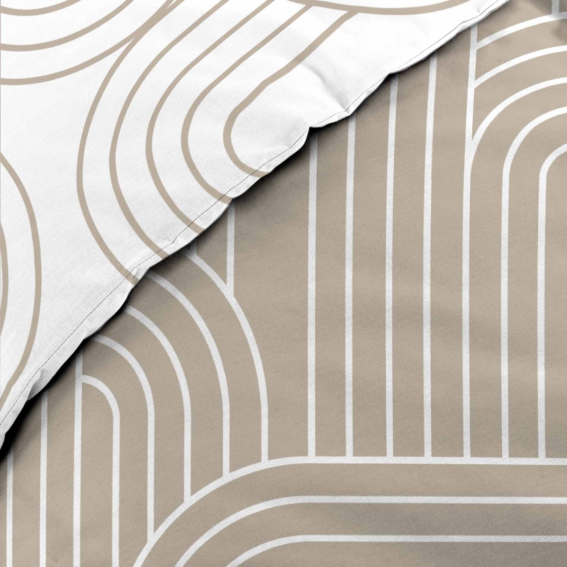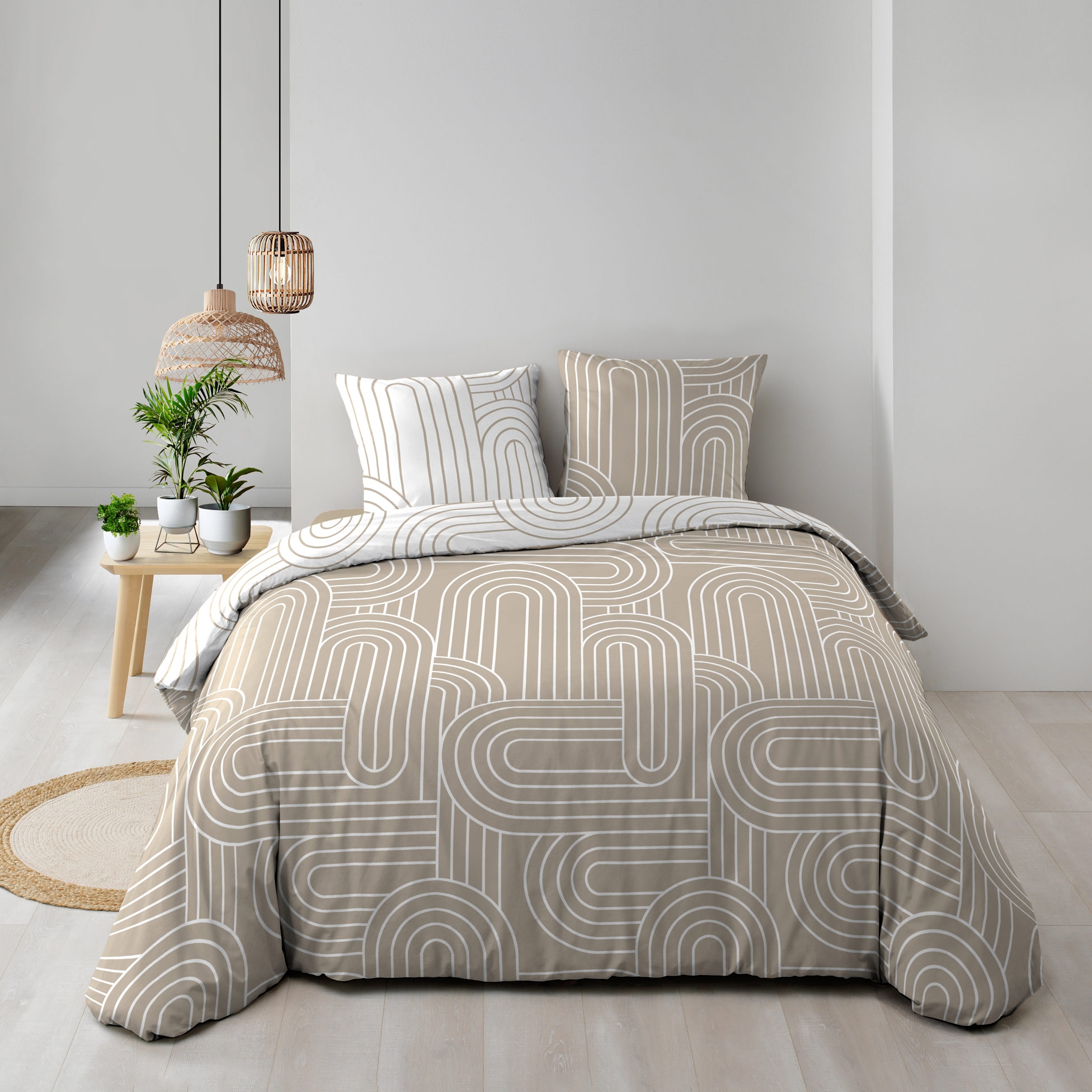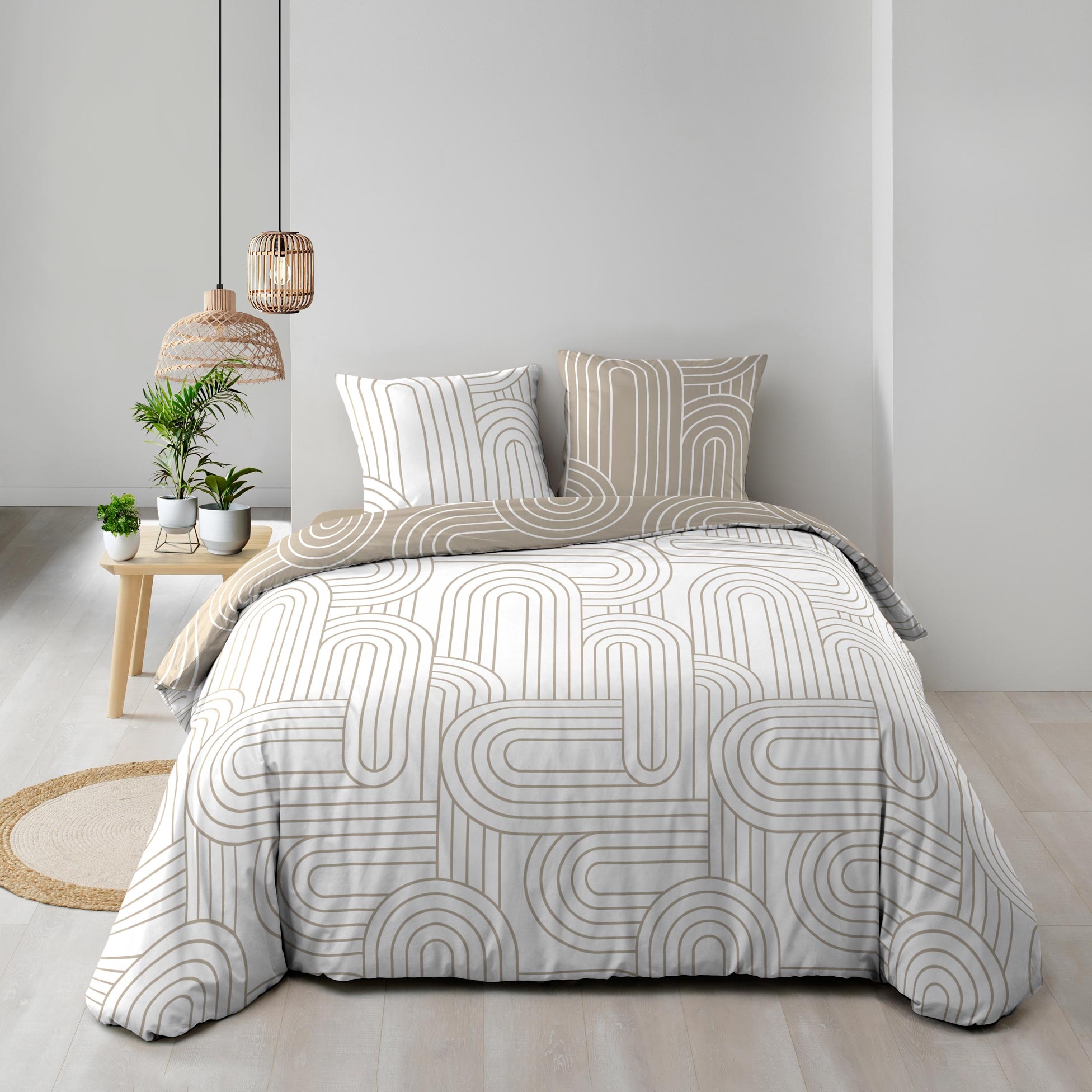 Offrez à votre chambre une touche graphique contemporaine avec la housse de couette MODUL. Son motif géométrique composé d’arcs entrelacés, en ton sur ton sable et blanc, structure l’espace avec modernité. Réversible, elle permet de varier l’ambiance entre deux faces inversées tout en gardant l’élégance du design.