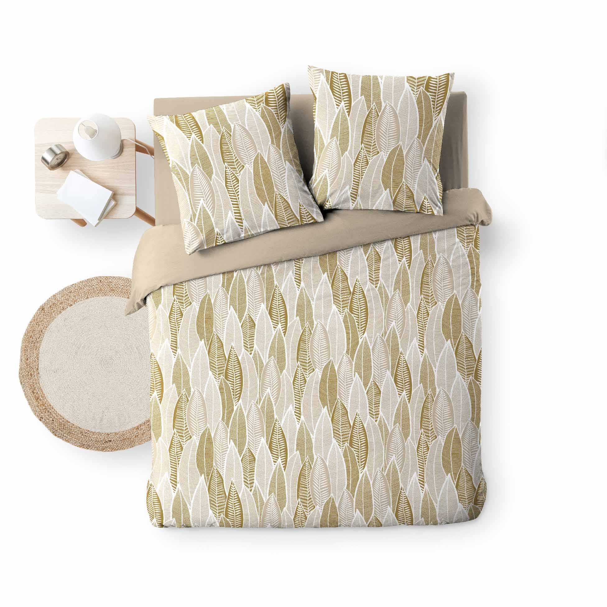 Parure de lit 240x220 cm + 2 taies – Microfibre imprimée KIM – Motif feuillage beige et or