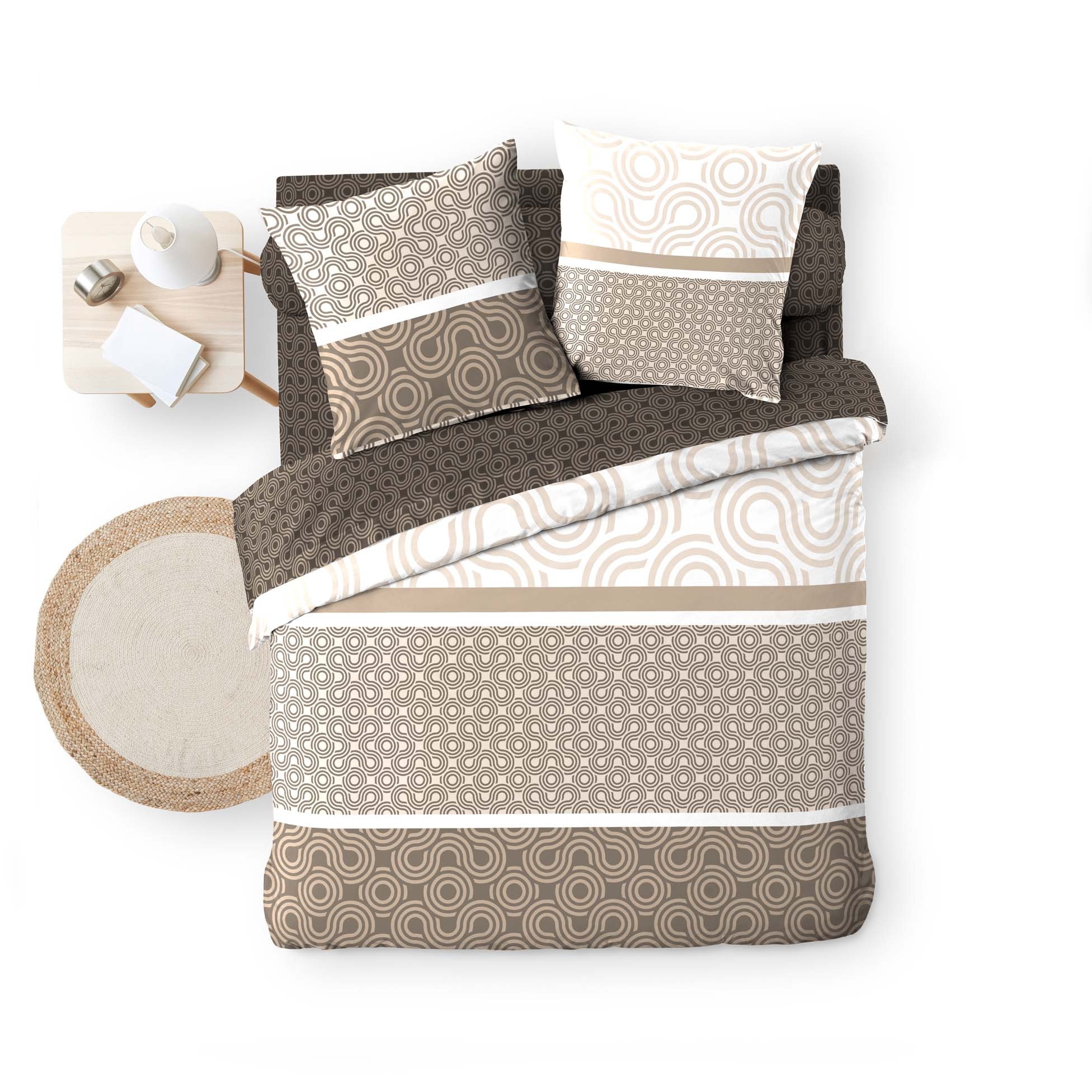 Apportez une touche graphique et chaleureuse à votre chambre avec la parure PACHA. Ses motifs géométriques raffinés et ses tons naturels beige, taupe et brun créent une atmosphère moderne et cosy. Conçue en pur coton 42 fils, elle allie confort et douceur pour des nuits sereines.