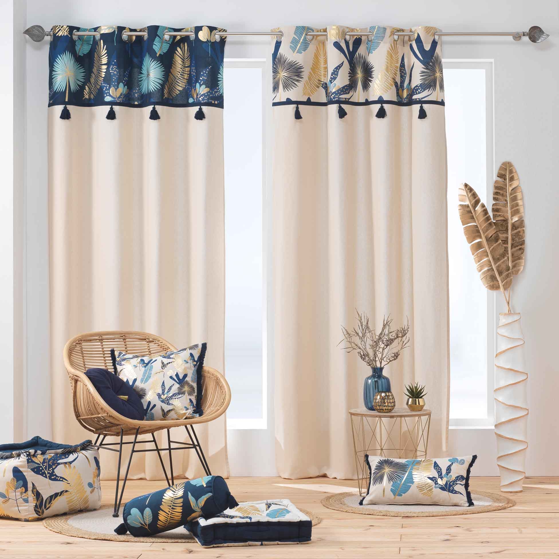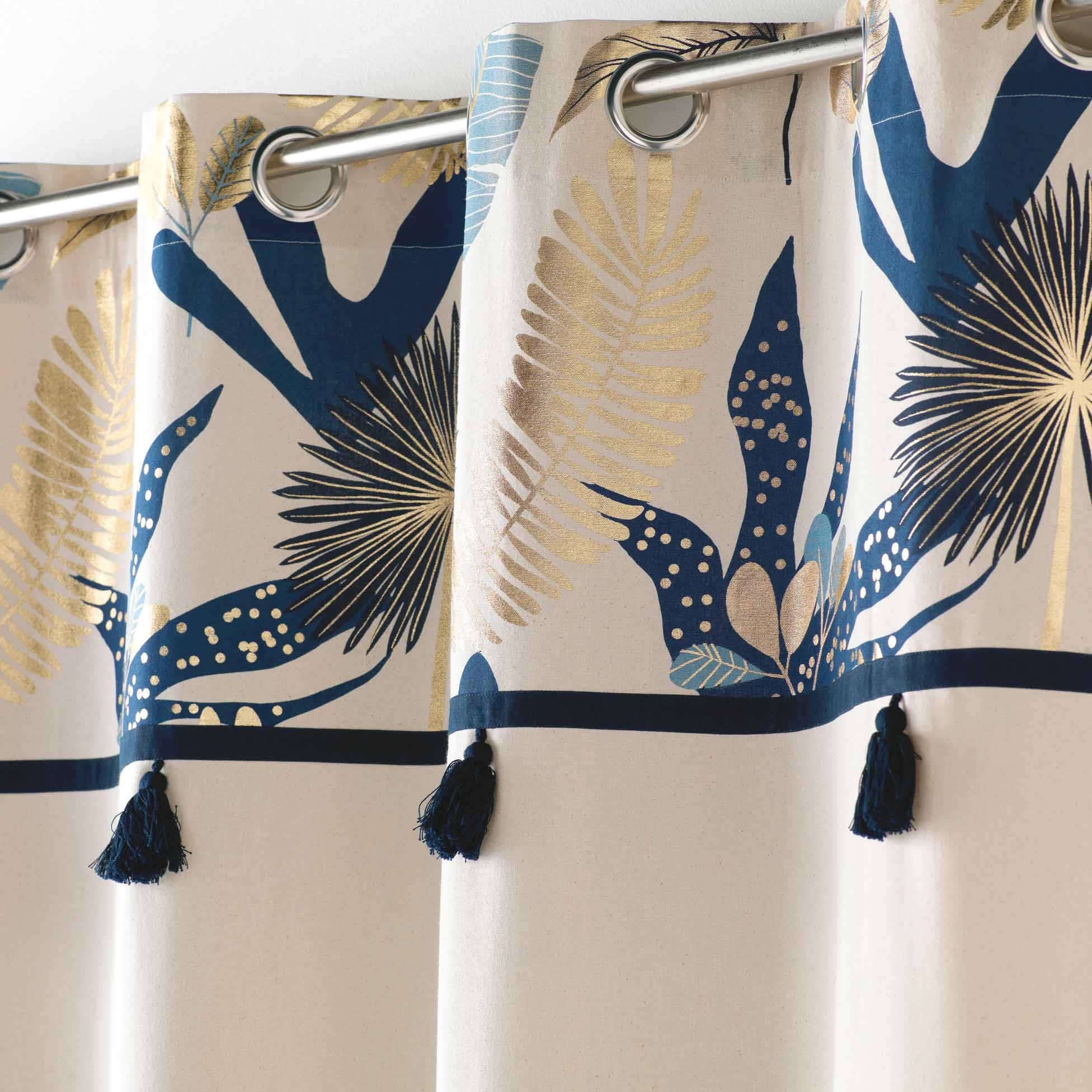 Offrez à votre intérieur une touche d'élégance tropicale avec le rideau à œillets PRUSSEOR. Son design unique associe un bas uni écru à un top imprimé de feuillages stylisés aux nuances bleu nuit, doré et bleu clair. De jolis pompons suspendus ajoutent une finition soignée et originale à ce modèle qui attire le regard tout en restant raffiné. Fabriqué en 100 % coton, il garantit douceur, tenue impeccable et confort visuel.
