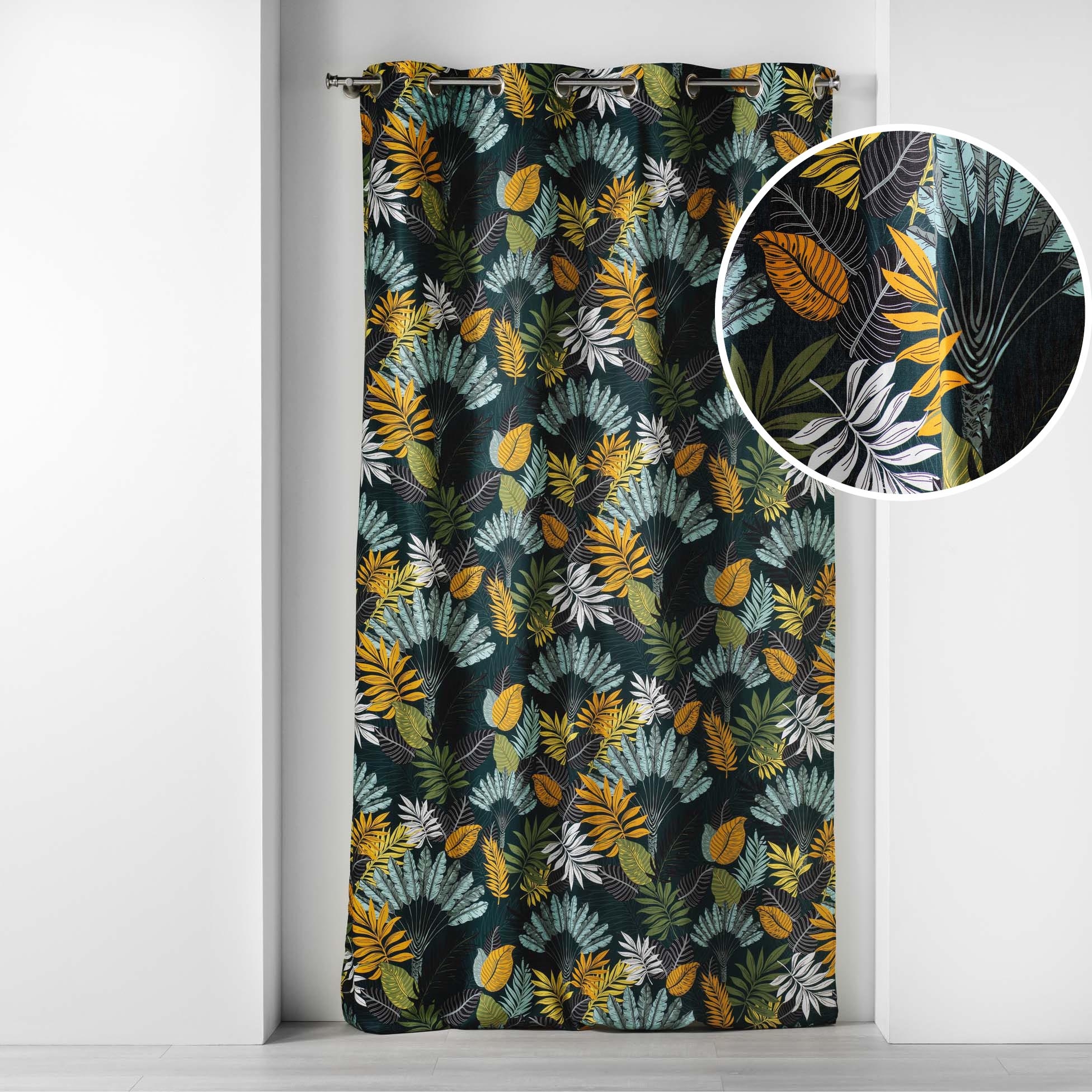 Donnez du caractère à votre intérieur avec le rideau Panazio. Son motif feuillage tropical bleu, jaune et vert sur fond foncé crée une ambiance exotique et chaleureuse. Conçu en coton, il offre un tombé souple et élégant, parfait pour habiller vos fenêtres avec style.