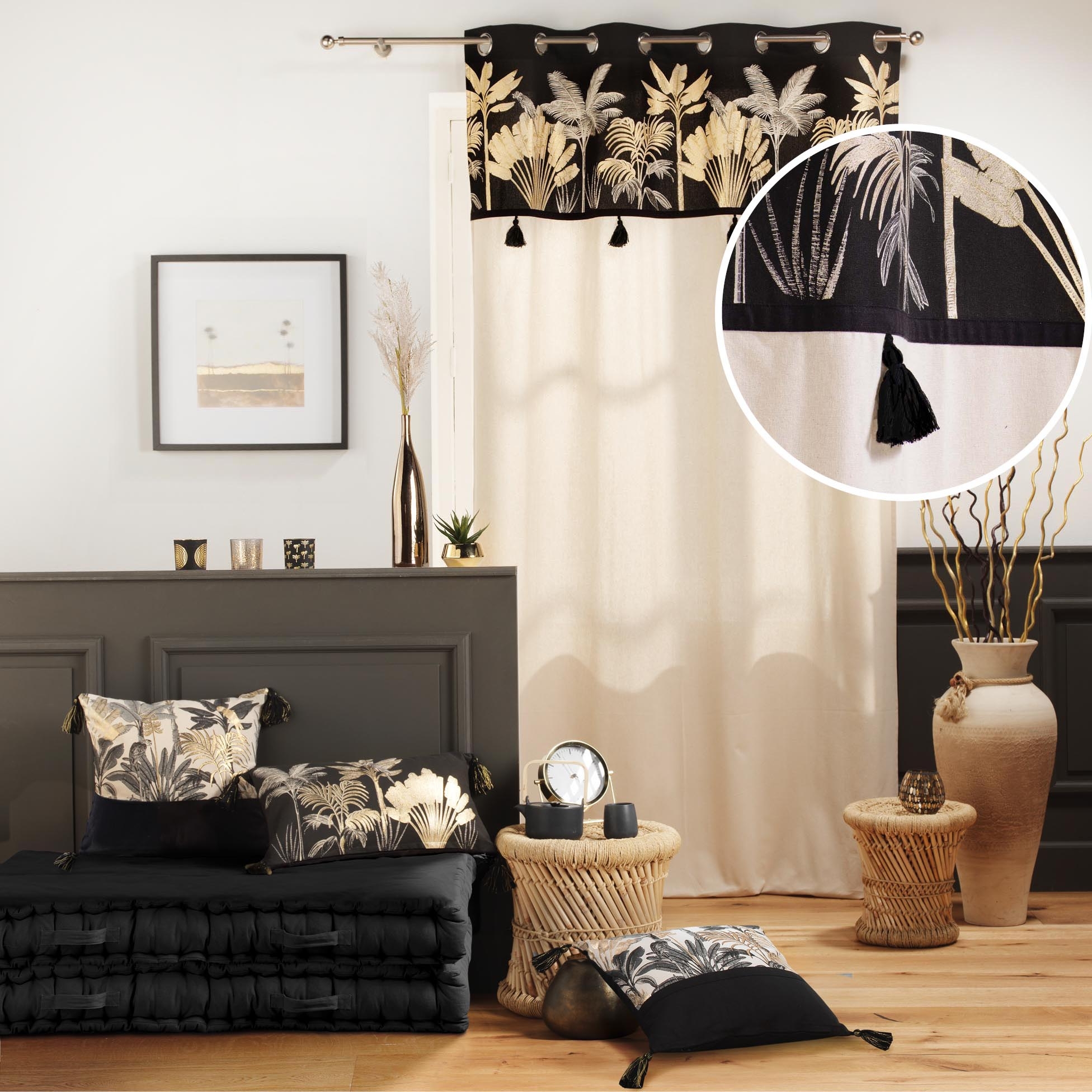 Apportez une touche d’élégance exotique à votre intérieur avec ce rideau à œillets Karaba. Son tissu uni en coton met en valeur un top imprimé métallisé aux motifs végétaux raffinés, sublimé par de jolis pompons noirs pour un détail chic et tendance.