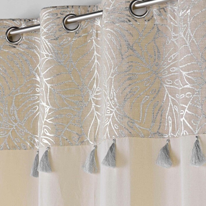 Sa partie haute présente un motif feuillage argenté délicatement lumineux, rehaussé de petits pompons décoratifs qui ajoutent une touche chic et originale à votre décoration. Le bas uni, dans un ton naturel doux, adoucit l’ensemble et s’intègre facilement dans toutes les ambiances, du classique au contemporain.