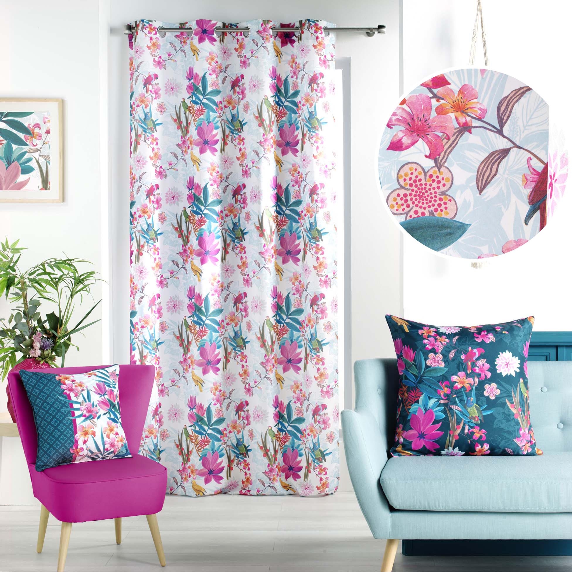 Apportez une explosion de couleurs et de fraîcheur à votre décoration avec le rideau Exotic Paradise Blanc. Confectionné en 100% polyester, il séduit par son tombé fluide et son entretien facile. Son imprimé floral exotique aux teintes vives (rose, bleu, vert, jaune) illumine la pièce et crée une ambiance joyeuse et dépaysante. Grâce à ses œillets métalliques, ce rideau s’installe en un clin d’œil et glisse aisément sur la tringle.