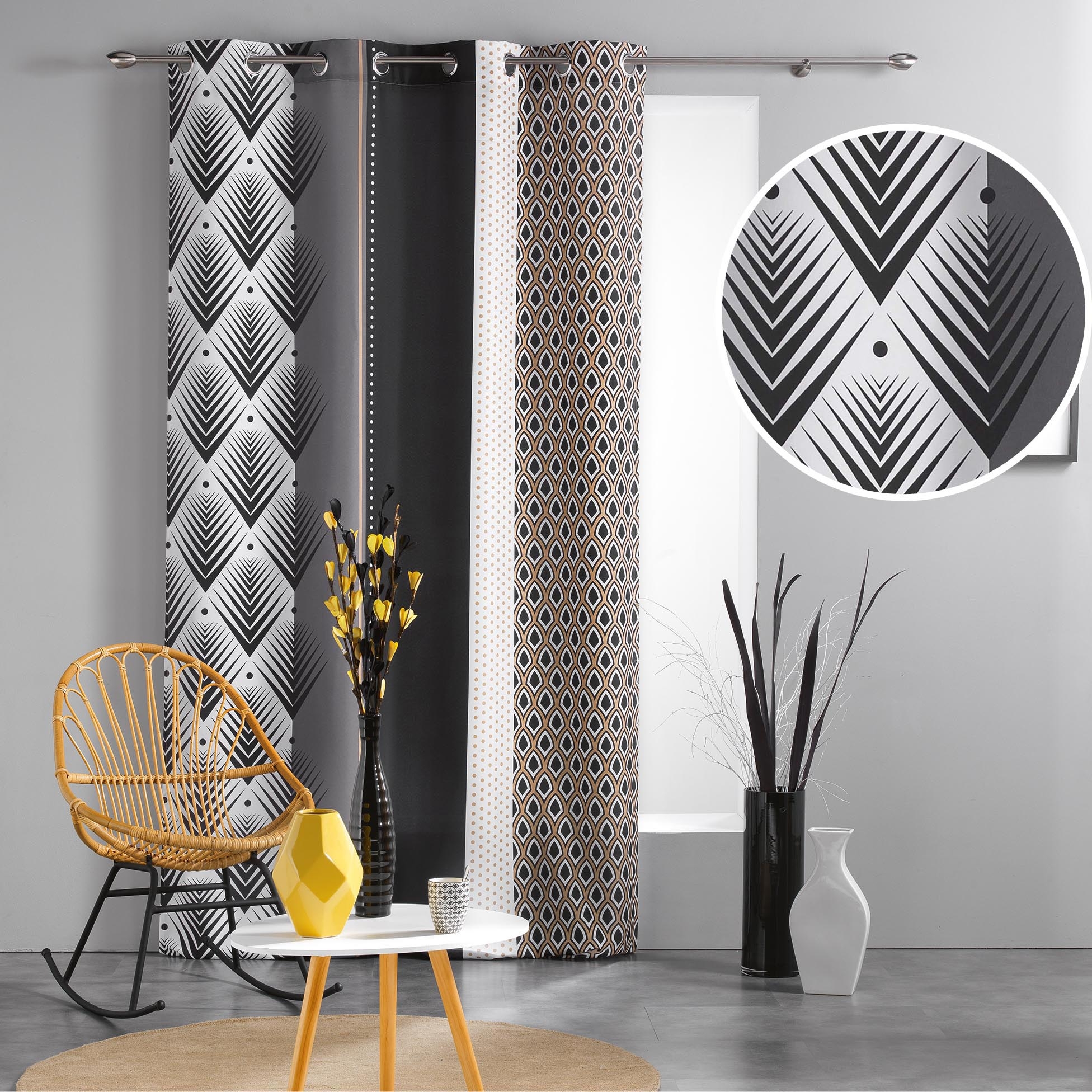 Apportez une touche graphique et contemporaine à votre décoration avec le rideau Galileo. Ses motifs géométriques audacieux dans les tons noir, blanc et doré créent un effet moderne et raffiné, idéal pour habiller vos fenêtres avec style. Conçu en polyester, il est facile d’entretien et offre un tombé fluide. Les œillets métalliques assurent une installation rapide et un rendu impeccable.