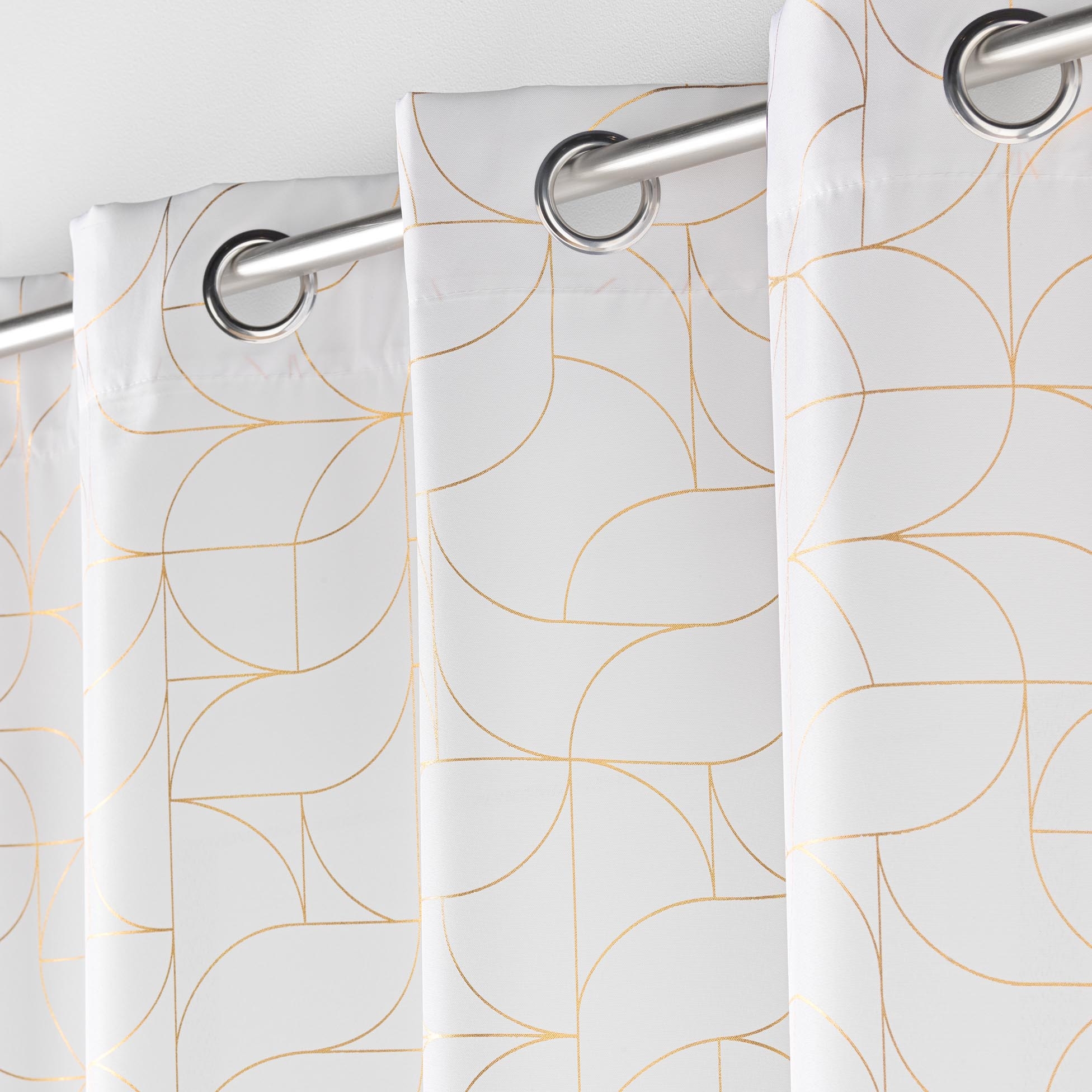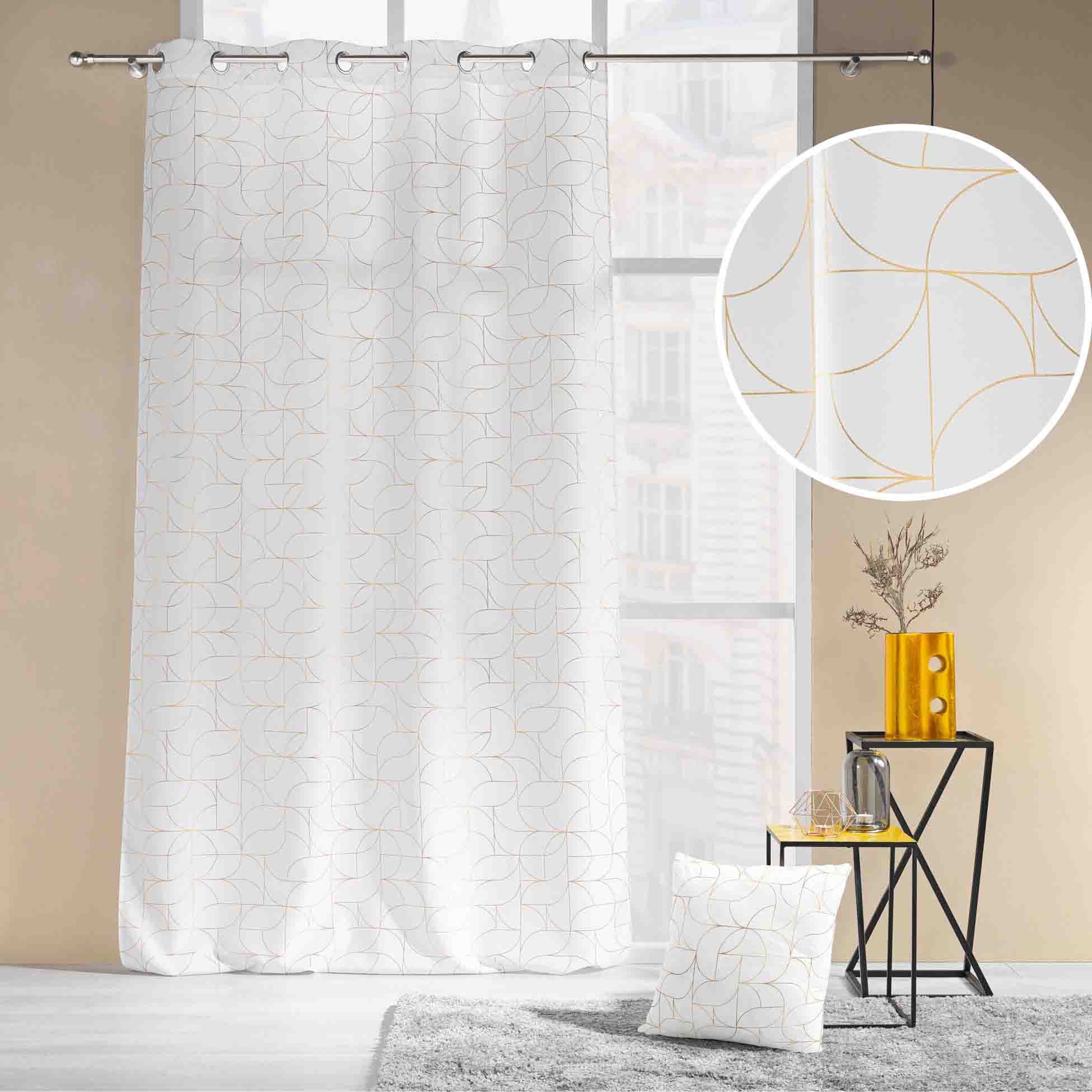 Le rideau Louxor Blanc illumine votre intérieur avec son motif géométrique métallisé à reflets dorés subtils.