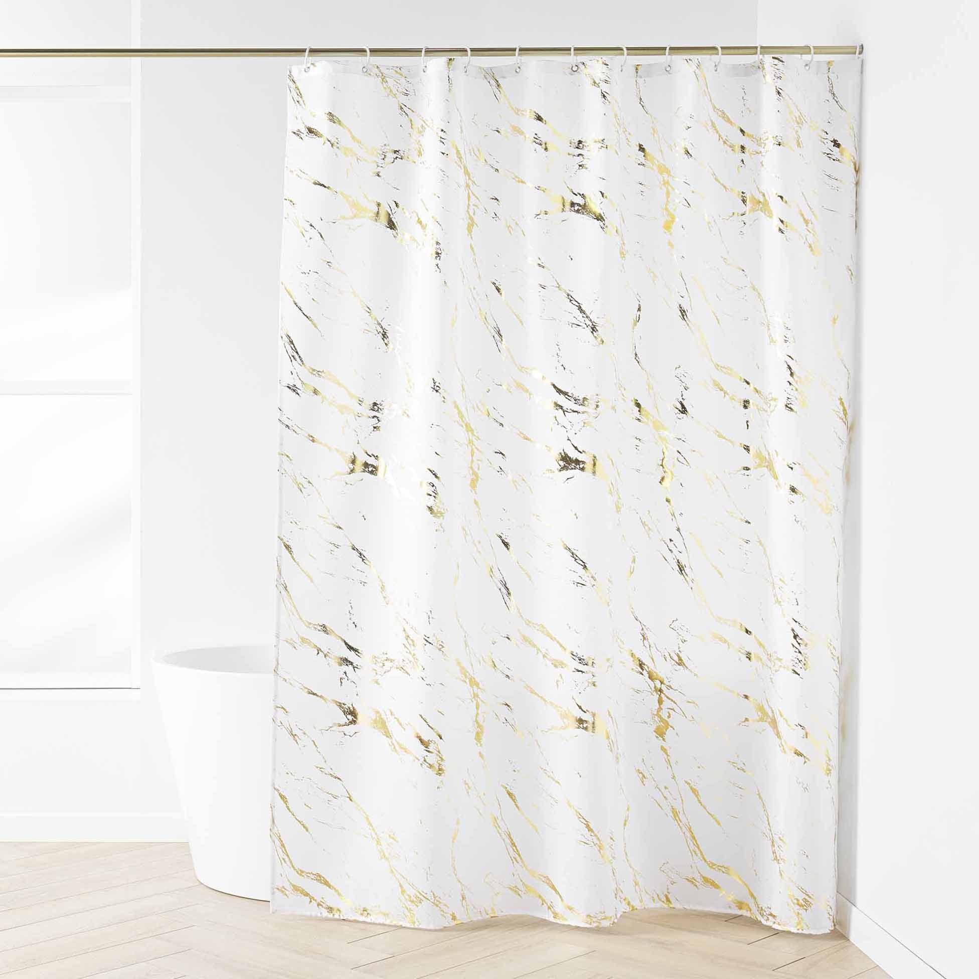 RIDEAU DE DOUCHE+CROCHETS 180 x 200 CM POLYESTER IMP. METAL. AQUAMARBRE BLANC/OR
