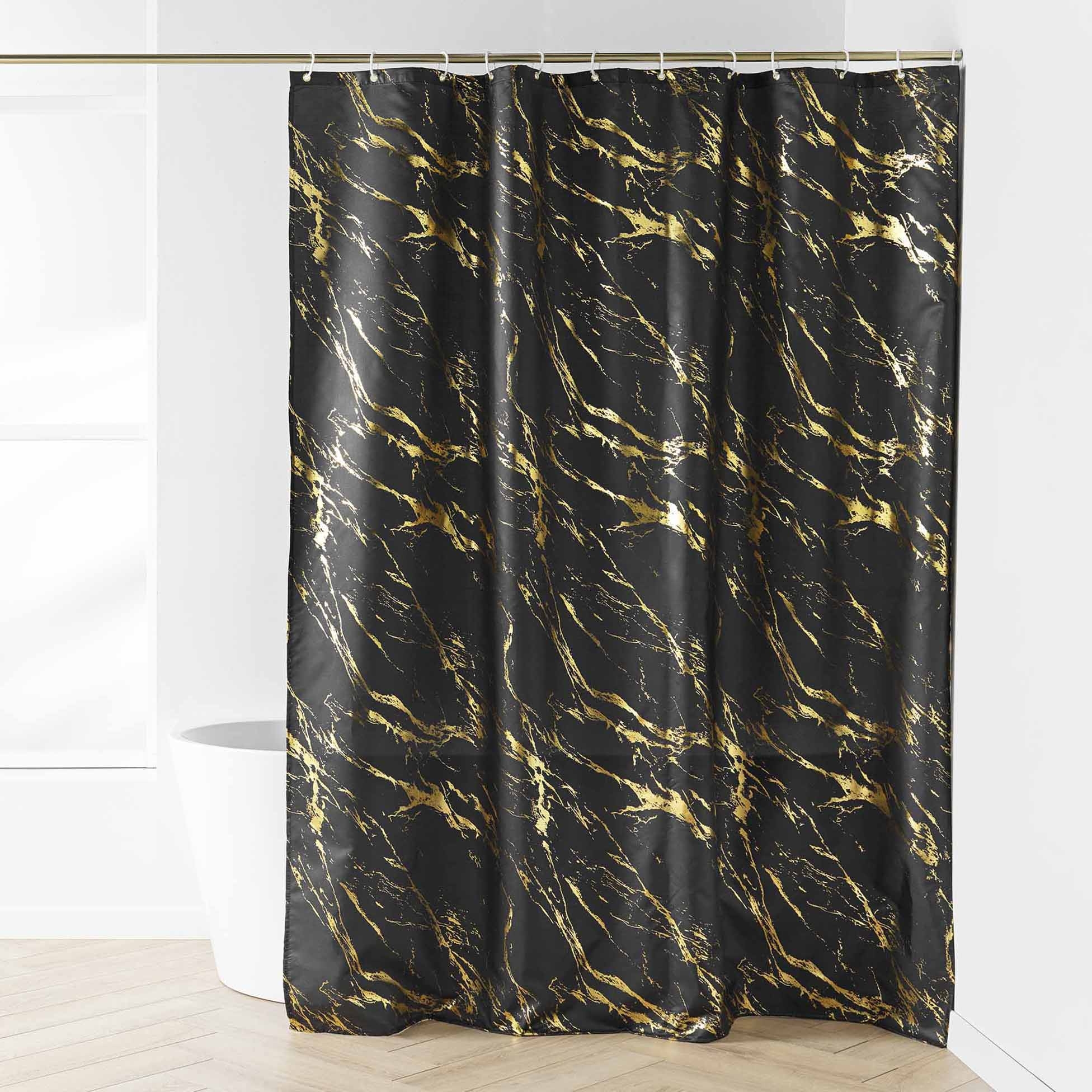 RIDEAU DE DOUCHE+CROCHETS 180 x 200 CM POLYESTER IMP. METAL. AQUAMARBRE NOIR/OR