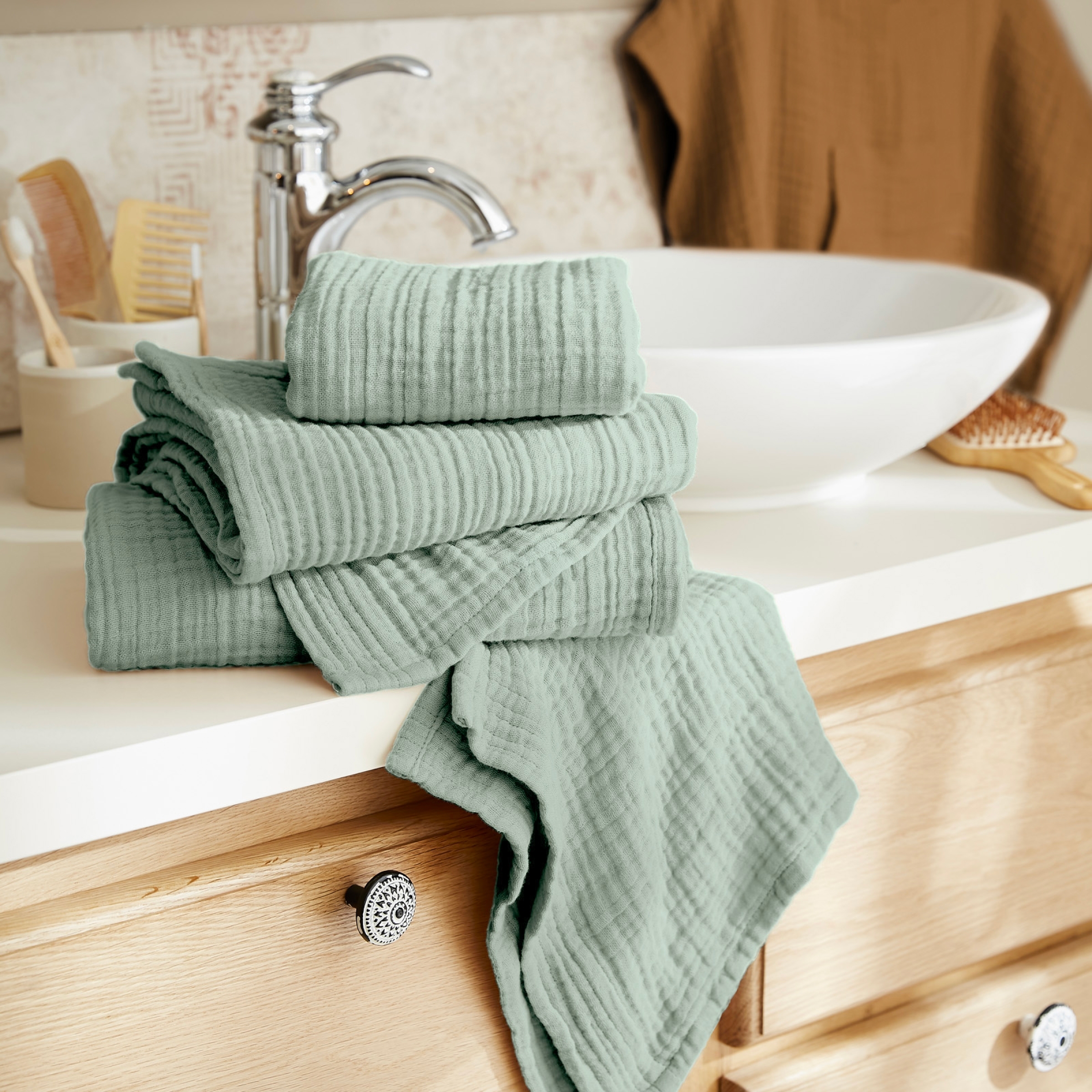 Apportez une touche de fraîcheur et de raffinement à votre salle de bain avec la serviette invité Gaïa en gaze de coton unie. Son coloris Eucalyptus, doux et naturel, évoque la sérénité et l’élégance d’un spa à domicile.