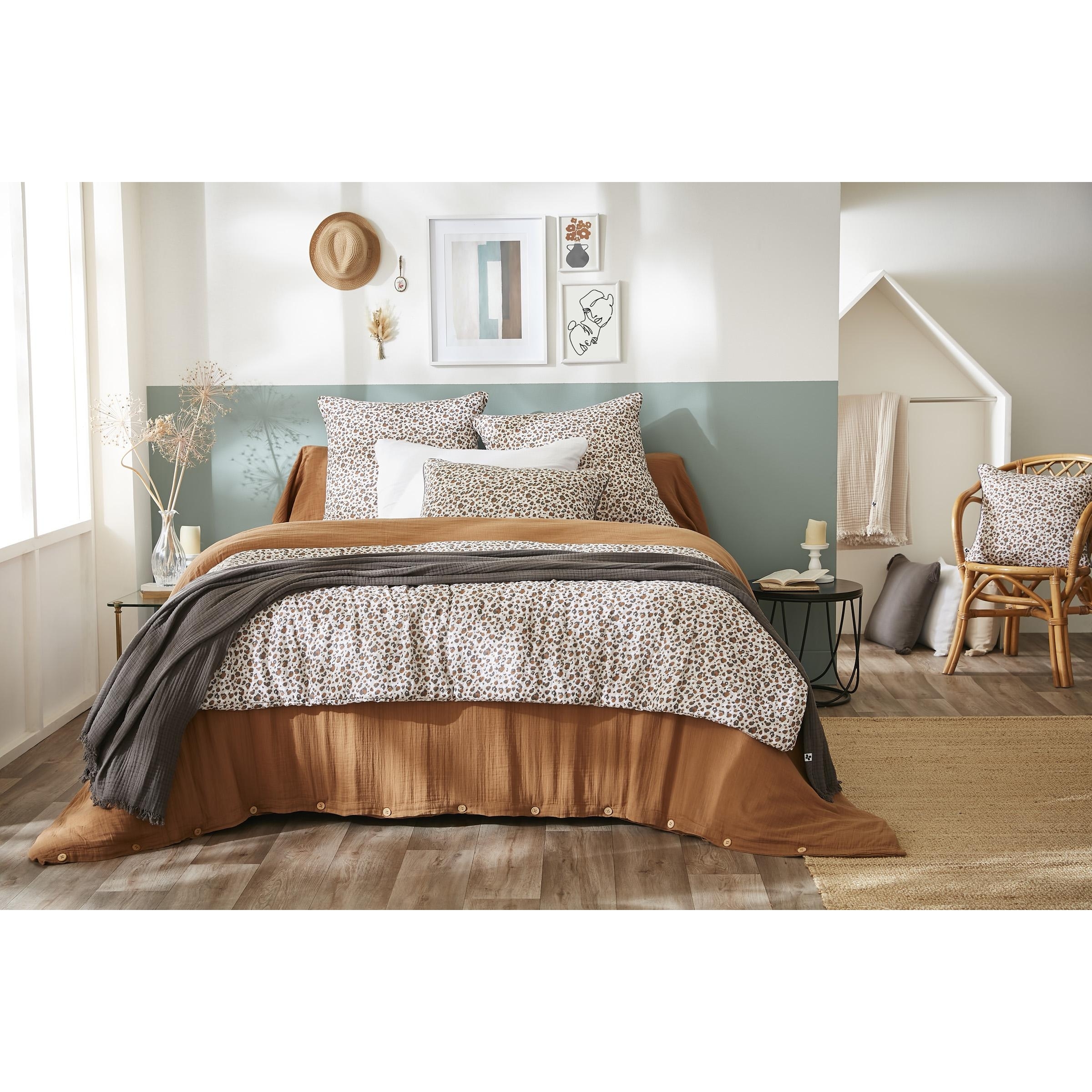 Sublimez votre chambre avec cette taie d’oreiller 60 x 60 cm confectionnée en double gaze de coton imprimée LÉONIE, un motif tacheté délicat mêlant des nuances caramel, brun et gris. À la fois moderne, chaleureuse et facile à associer, elle apporte instantanément un style naturel et raffiné à votre linge de lit.